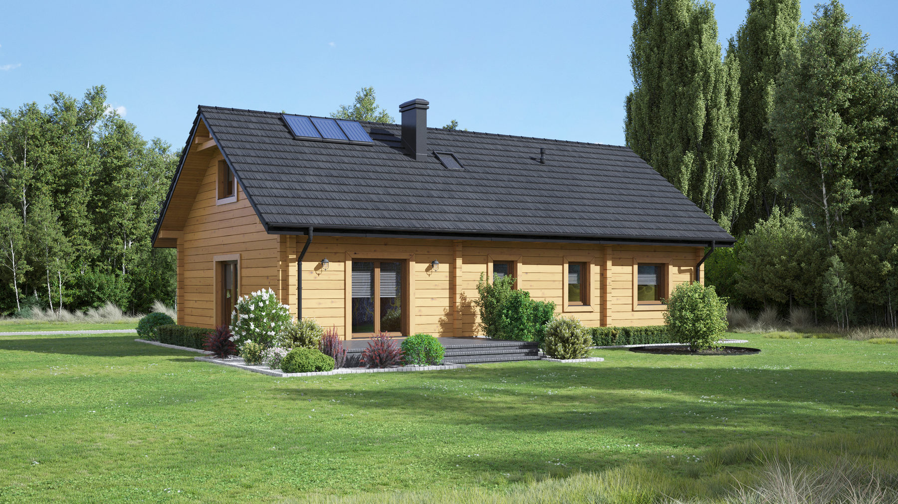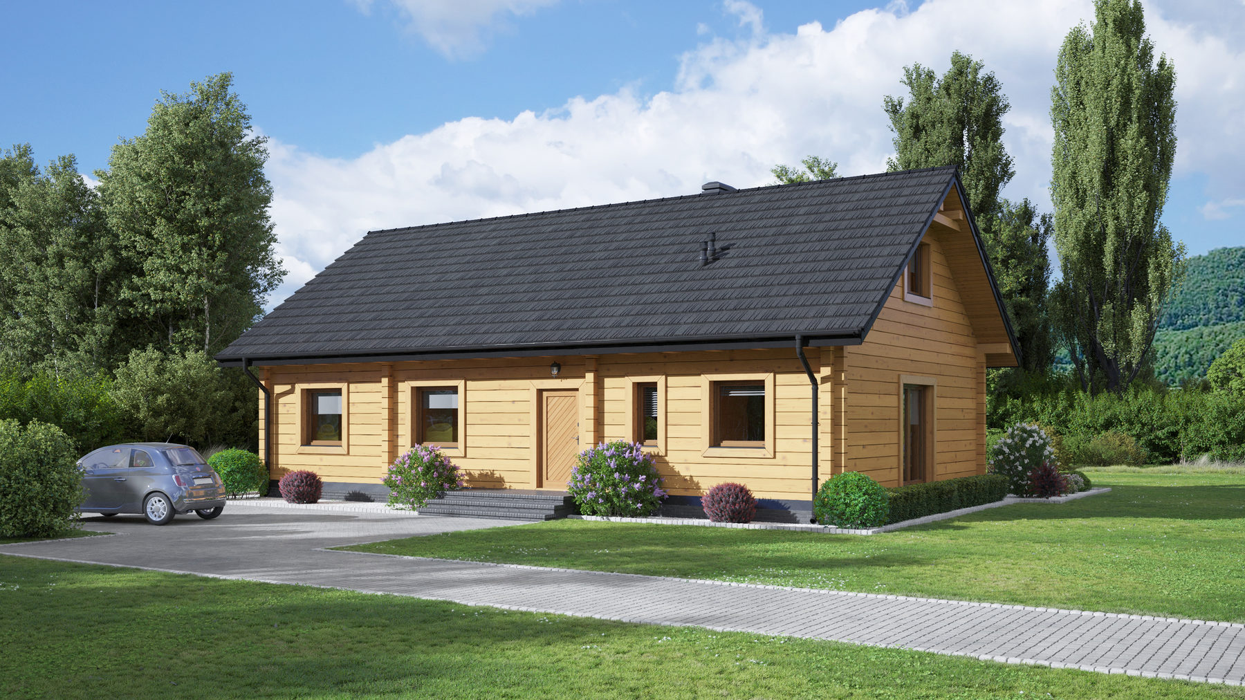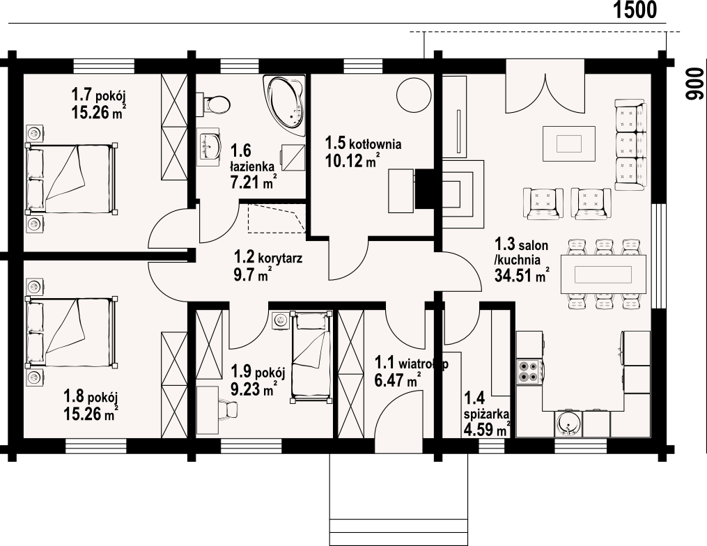 Dom z bali drewnianych. Parterowy. Duży salon z kuchnią, kominkiem oraz wyjściem na taras. Trzy pokoje, łazienka, kotłownia, korytarz, wiatrołap i spiżarka. Wyjście na poddasze nieużytkowe schodami strychowymi składanymi. Zwarta bryła budynku oraz dach dwuspadowy sprzyjają szybkiej i taniej budowie i niskim kosztom eksploatacji.
