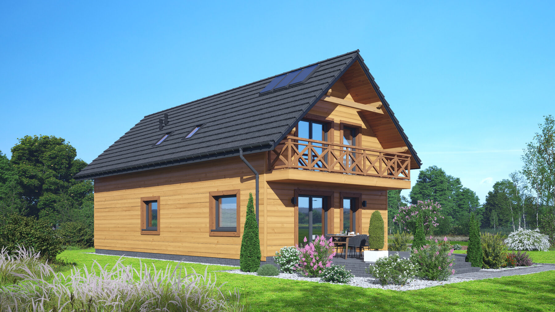 Dom w konstrukcji szkieletu drewnianego. Na parterze salon z aneksem kuchennym oraz wyjściem na taras. Komunikacja, łazienka, pokój do pracy, wiatrołap, garaż. Na poddaszu trzy pokoje, łazienka, schowek, komunikacja, garderoba oraz balkon dostępny z dwóch pokoi. Zwarta bryła budynku i dach dwuspadowy sprzyjają szybkiej i taniej budowie oraz niskim kosztom eksploatacji.