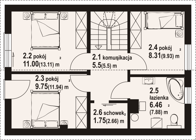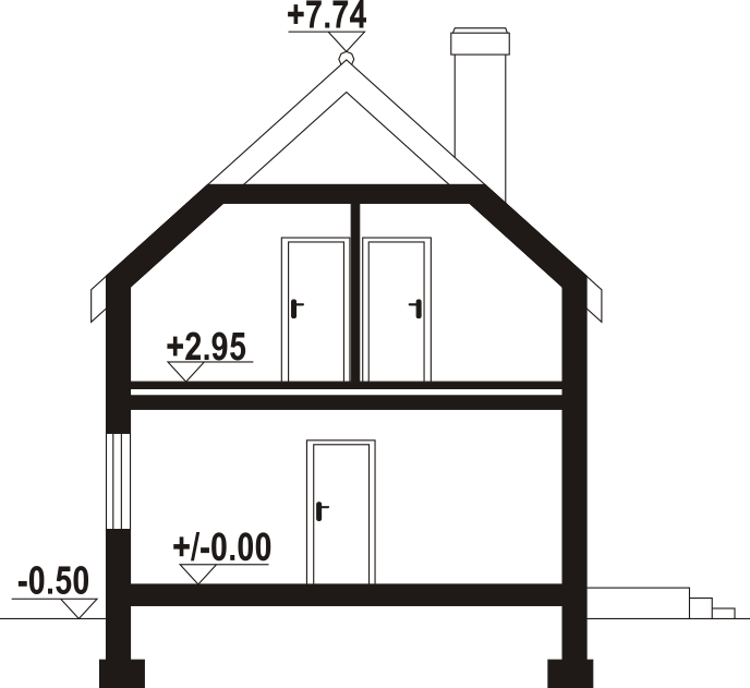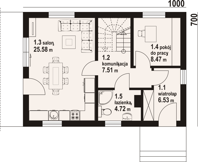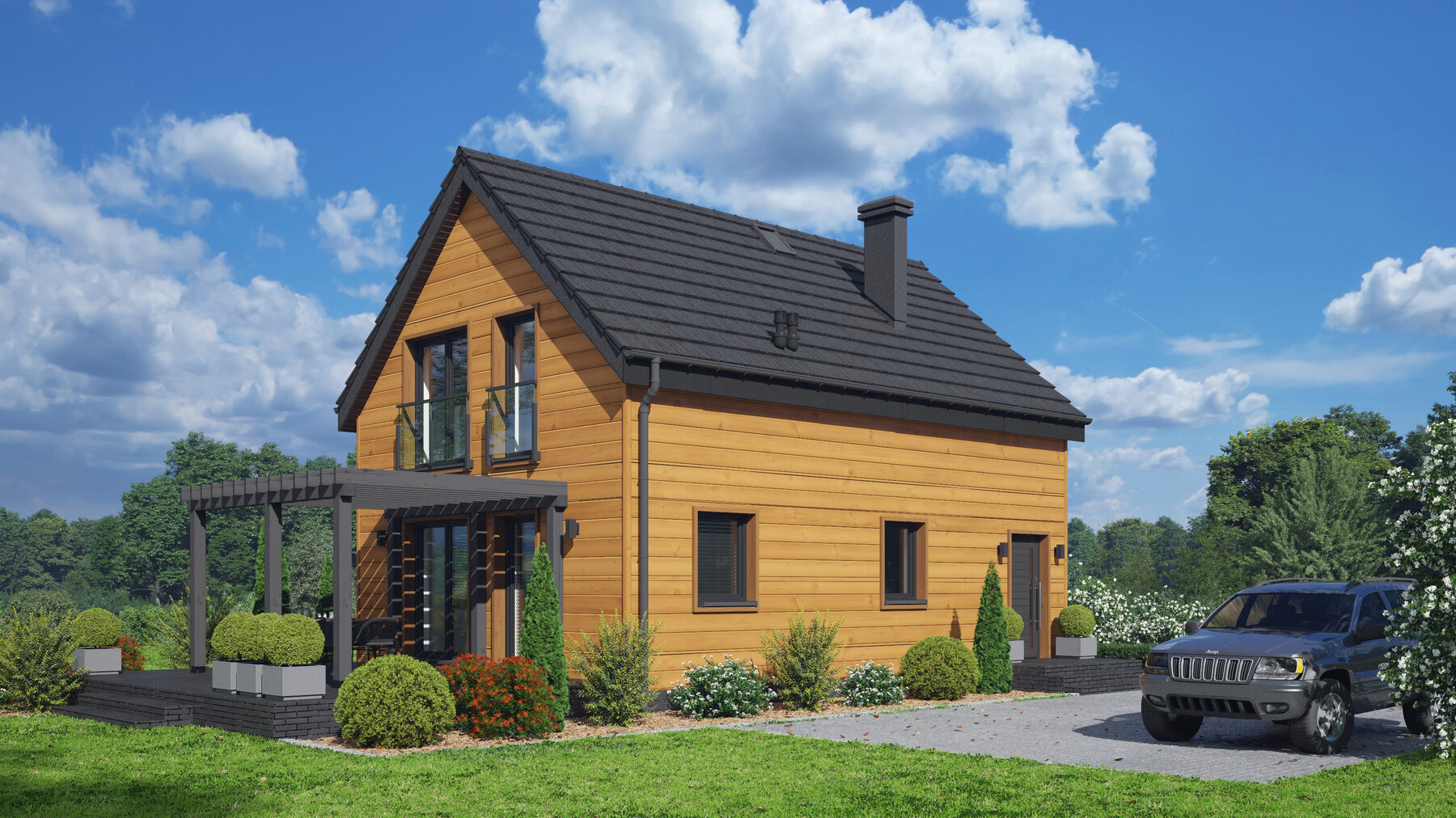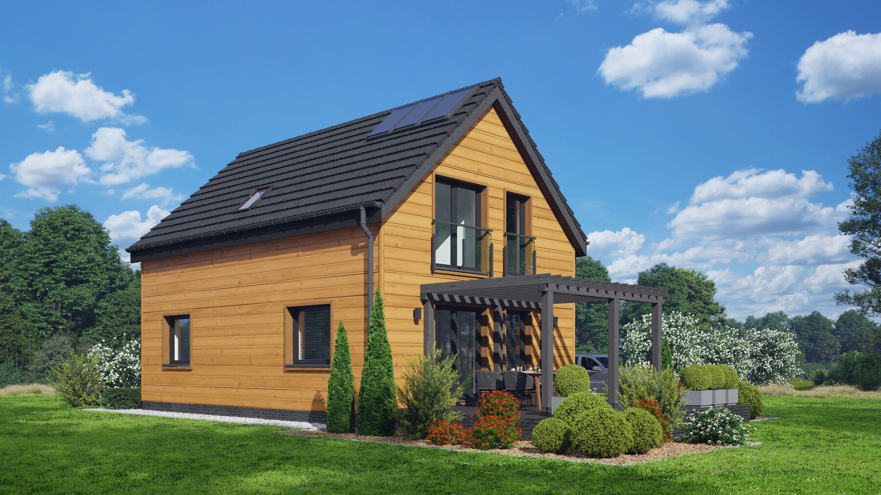 Dom w konstrukcji szkieletu drewnianego. Na parterze salon z aneksem kuchennym oraz wyjściem na taras. Pokój do pracy, łazienka, komunikacja, wiatrołap. Na poddaszu trzy pokoje, komunikacja, schowek, łazienka. Zwarta bryła budynku oraz dach dwuspadowy sprzyjają szybkiej i taniej budowie oraz niskim kosztom eksploatacji.