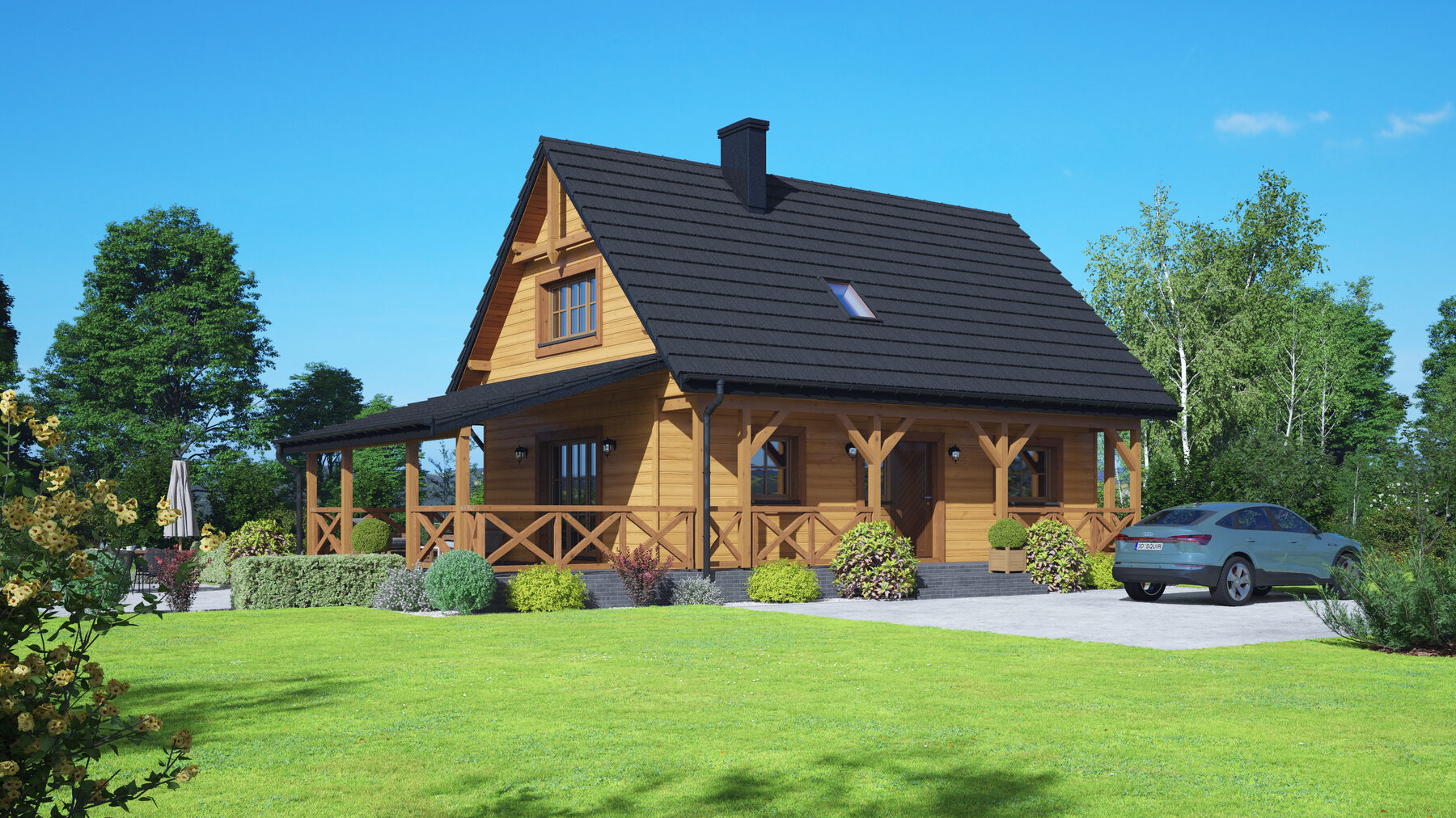 Dom w konstrukcji szkieletu drewnianego. Na parterze salon z aneksem kuchennym, kominkiem oraz wyjściem na duży, zadaszony taras. Pokój, łazienka, wiatrołap, schowek. Na poddaszu dwa pokoje, garderoba, łazienka, komunikacja. Zwarta bryła budynku oraz dach dwuspadowy sprzyjają szybkiej i taniej budowie oraz niskim kosztom eksploatacji.