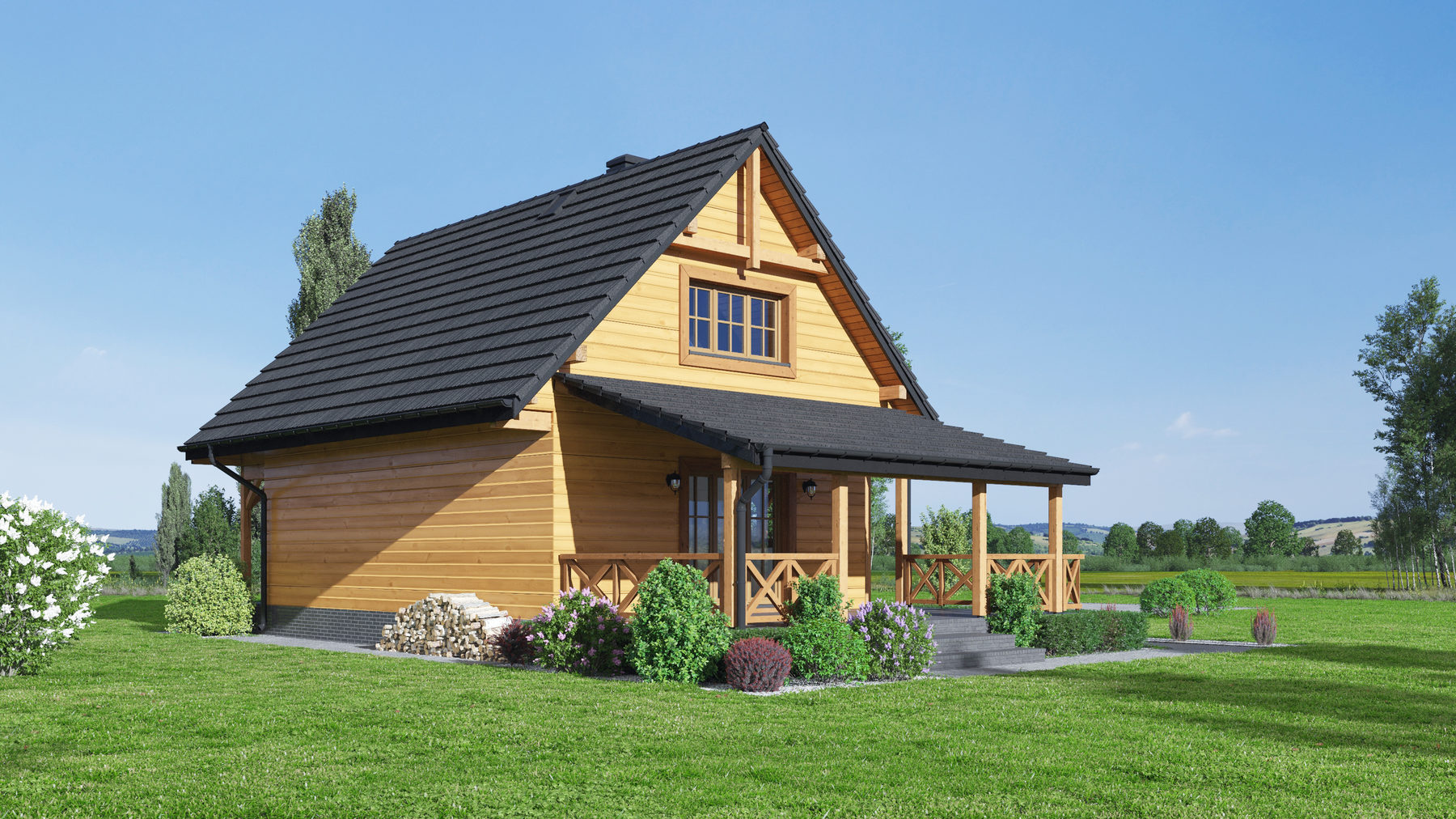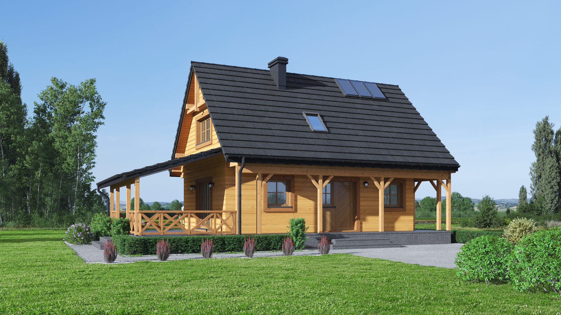 Dom w konstrukcji szkieletu drewnianego. Na parterze duży salon z aneksem kuchennym, kominkiem oraz wyjściem na duży, zadaszony taras. Pokój, łazienka, wiatrołap, schowek pod schodami. Na poddaszu dwa pokoje, garderoba, komunikacja oraz łazienka. Zwarta bryła budynku oraz dach dwuspadowy sprzyjają szybkiej i taniej budowie oraz niskim kosztom eksploatacji.
