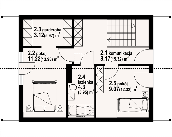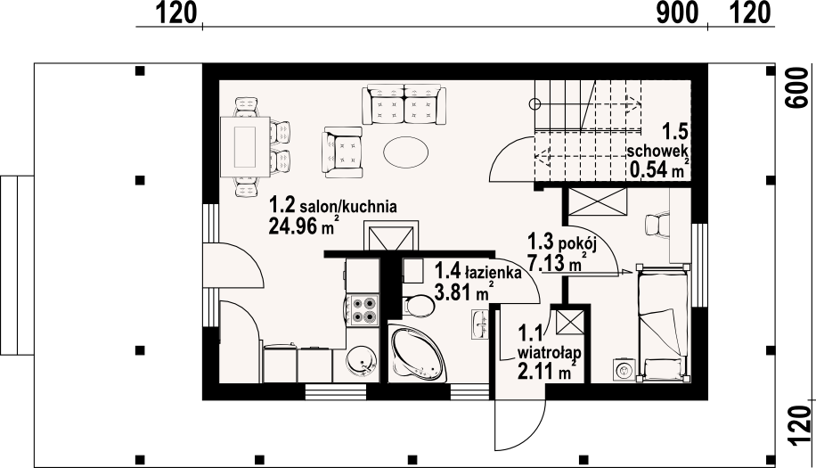 Dom w konstrukcji szkieletu drewnianego. Duży salon z aneksem kuchennym, kominkiem, schodami na poddasze i wyjściem na zadaszony taras. Pokój, łazienka, wiatrołap. Na poddaszu dwa pokoje, łazienka, garderoba, komunikacja i dwa balkony. Zwarta bryła budynki i dach dwuspadowy sprzyjają szybkiej i taniej budowie i niskim kosztom eksploatacji.