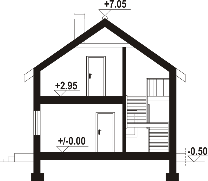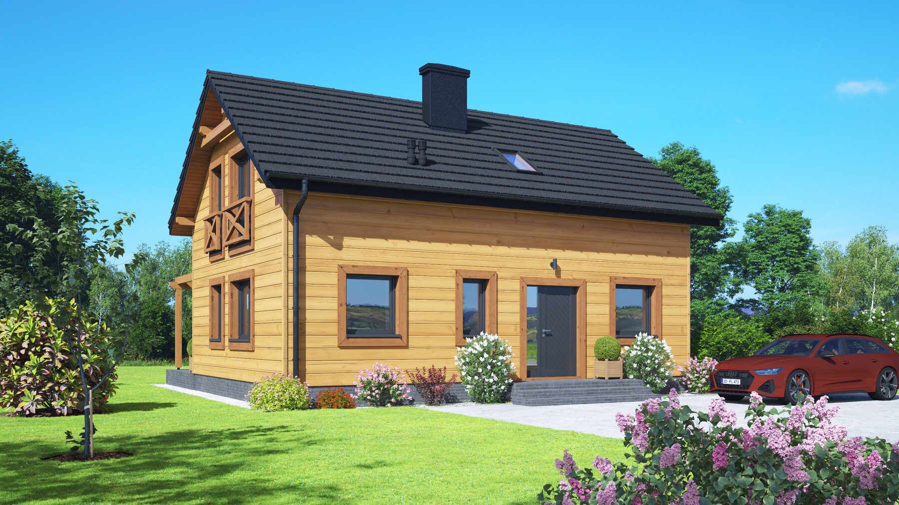 Dom w konstrukcji szkieletu drewnianego. Salon z aneksem kuchennym, kominkiem oraz wyjściem na taras. Pokój do pracy, wc, wiatrołap. Na poddaszu trzy pokoje, łazienka, komunikacja. Zwarta bryła budynku oraz dach dwuspadowy sprzyjają szybkiej i taniej budowie oraz niskim kosztom eksploatacji.