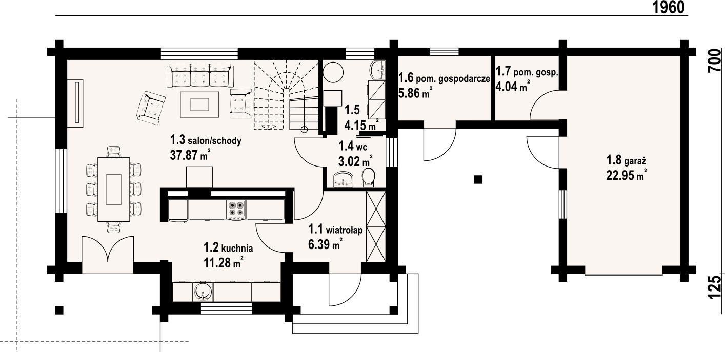 Dom z bali drewnianych. Duży salon z jadalnią, wyjściem na zadaszony taras, kominkiem i schodami na poddasze. Kuchnia, wiatrołap, wc z pralnią, pomieszczenia gospodarcze i garaż. Na poddaszu trzy pokoje, dwie łazienki, garderoba i komunikacja.
