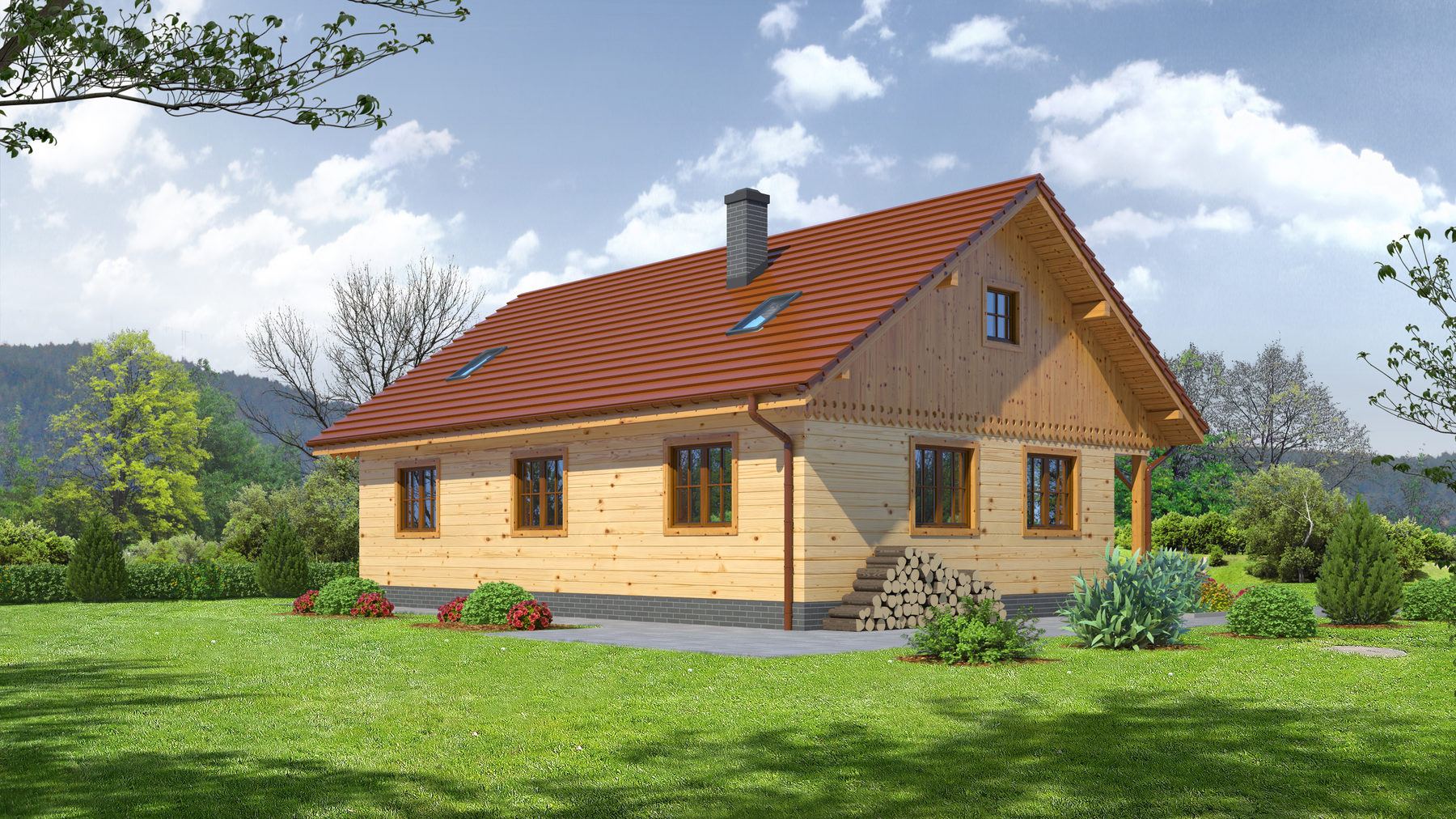 Nieduży dom parterowy w technologii szkieletowej. Idealny na działkę z wejściem od południa. Program użytkowy domu stanowią: duży salon z kominkiem i wyjściem na taras, otwarta kuchnia, dwa pokoje, łazienka, komunikacja, wiatrołap oraz kotłownia.
