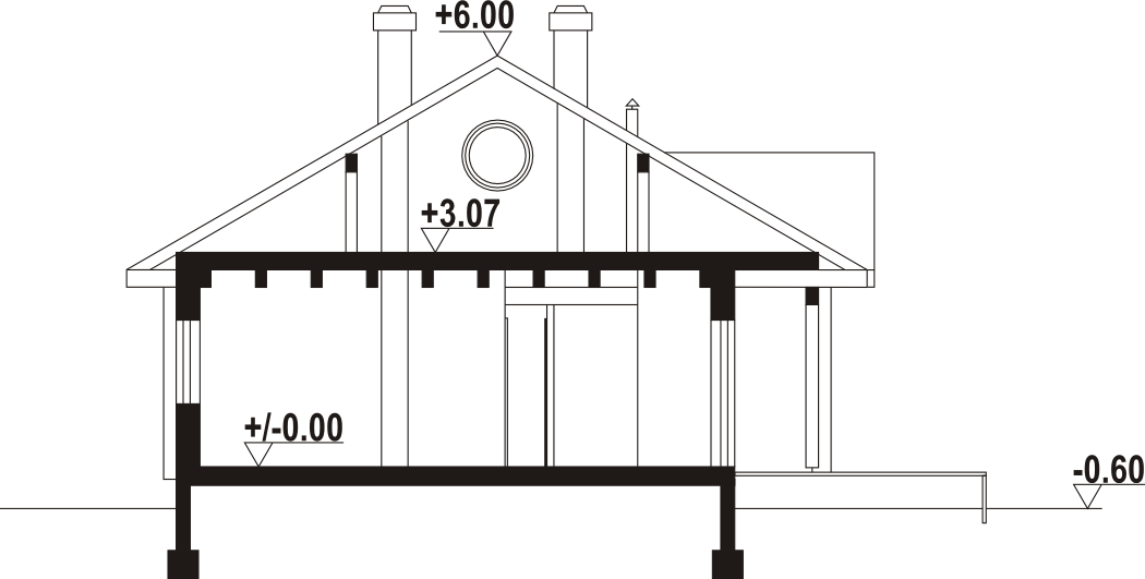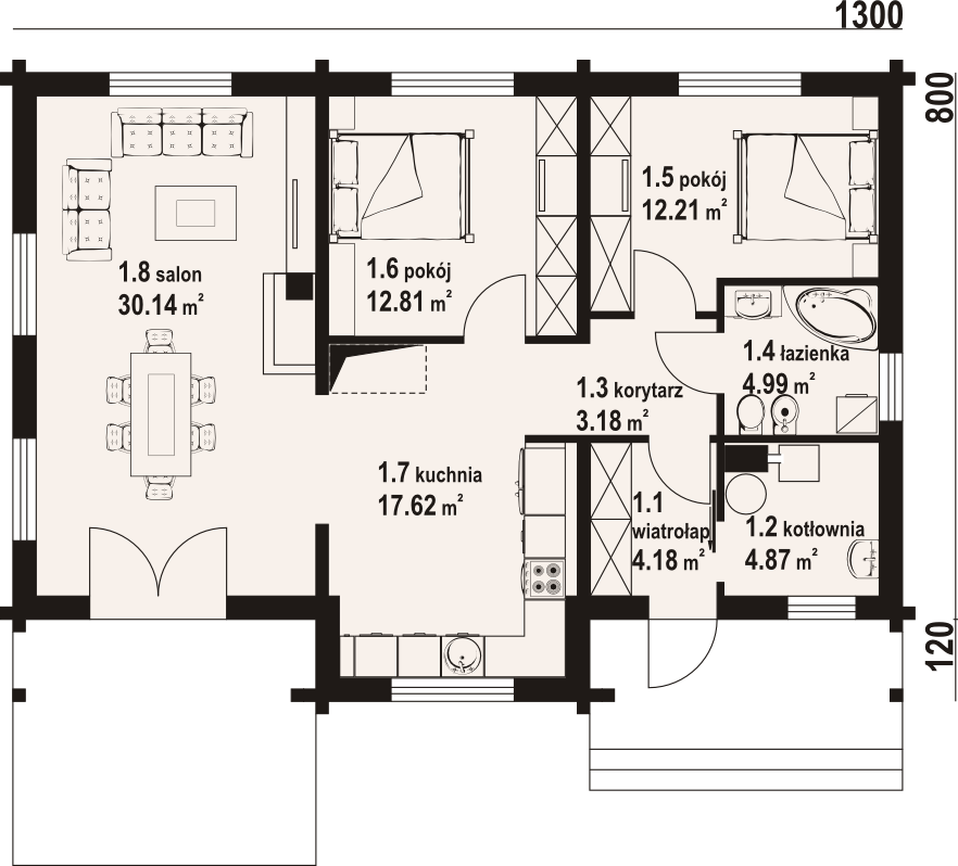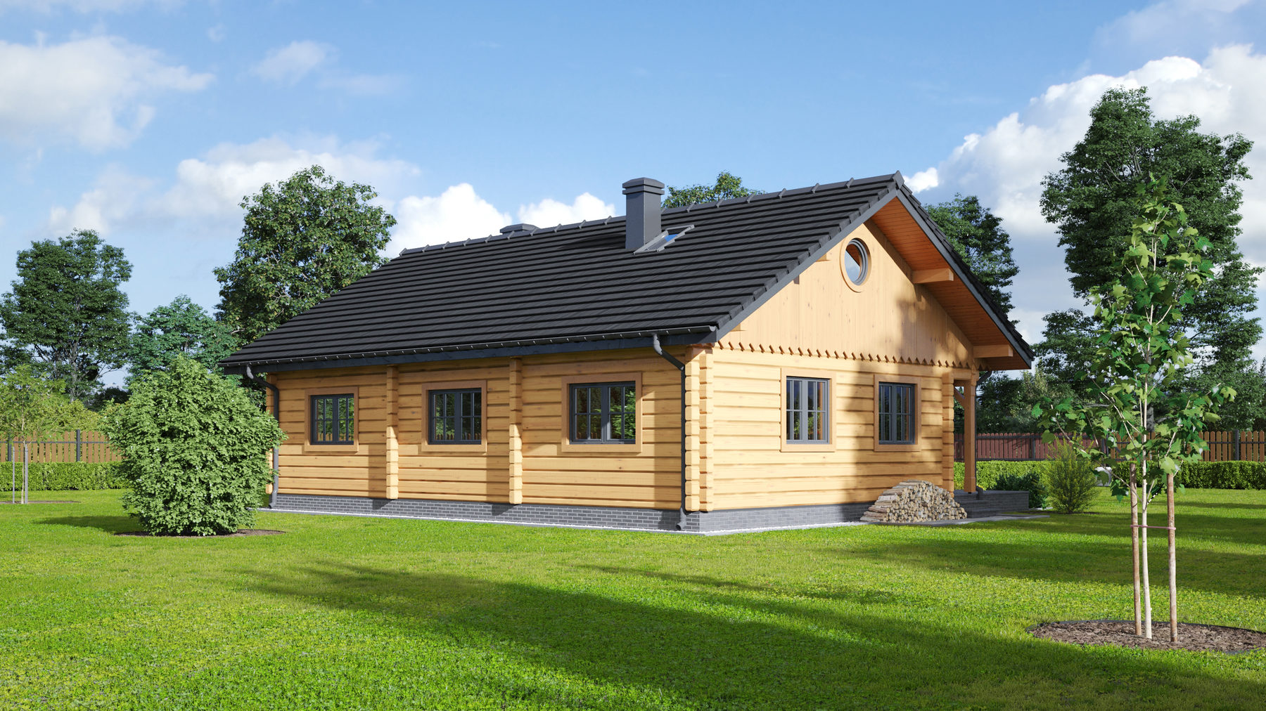 Dom parterowy z bali. Duży salon z aneksem kuchennym, kominkiem i wyjściem na taras. Dwa pokoje, łazienka, kotłownia, korytarz i wiatrołap. Wyjście na poddasze schodami strychowymi rozkładanymi.