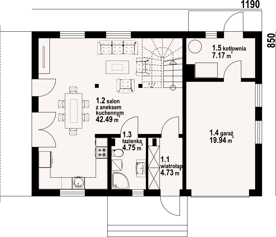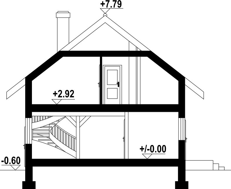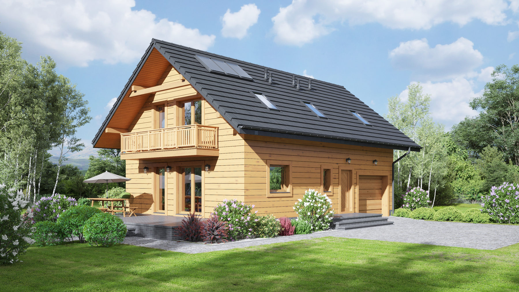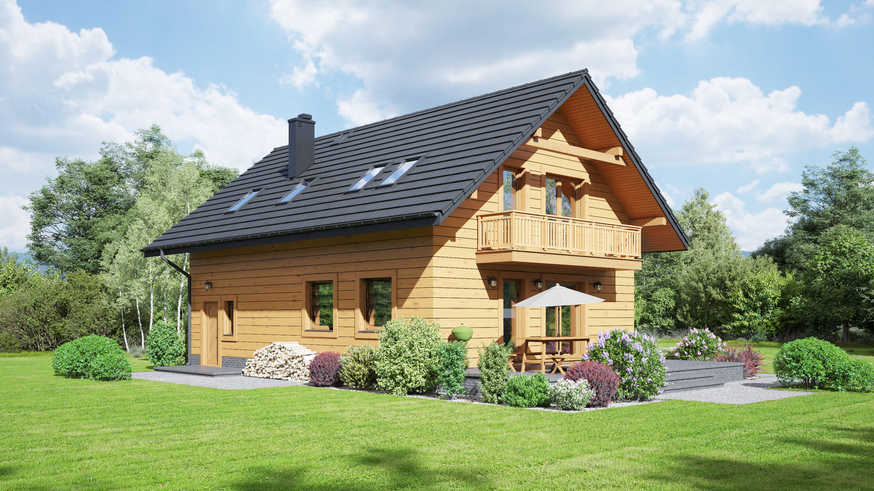 Dom w konstrukcji szkieletu drewnianego. Duży salon z aneksem kuchennym, schodami na poddasze i wyjściami na taras. Łazienka, wiatrołap, garaż i kotłownia. Na poddaszu cztery pokoje, łazienka, wc, komunikacja i balkon. Zwarta bryła budynku i dach dwuspadowy sprzyjają szybkiej i taniej budowie i niskim kosztom eksploatacji.