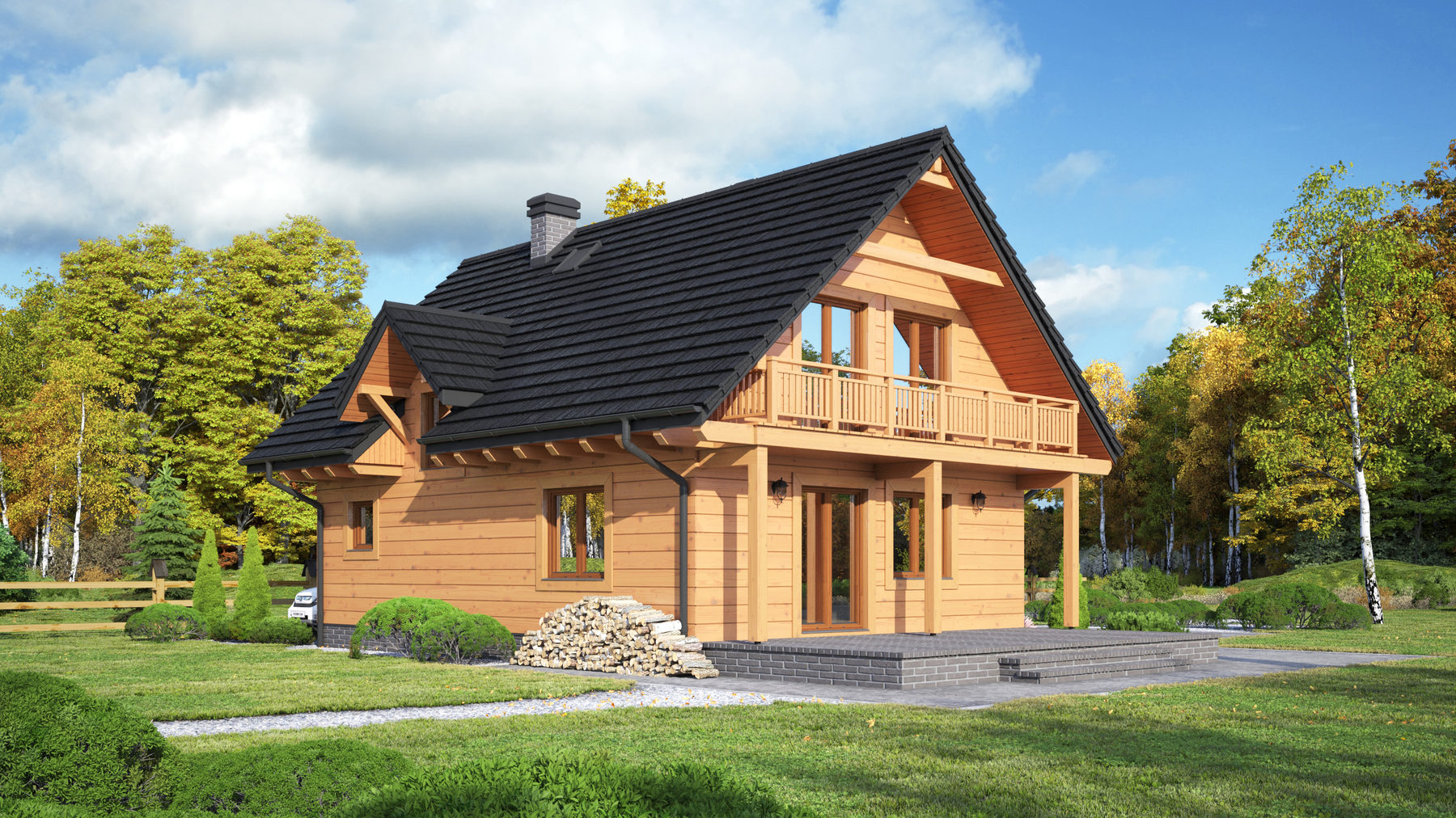 Dom w konstrukcji szkieletu drewnianego. Duży salon a aneksem kuchennym, kominkiem i wyjściem na taras. Pokój, łazienka, komunikacja i wiatrołap. Na poddaszu trzy pokoje, łazienka, komunikacja i balkon. Zwarte bryła budynku i dach dwuspadowy sprzyjają taniej i szybkiej budowie i niskim kosztom eksploatacji.