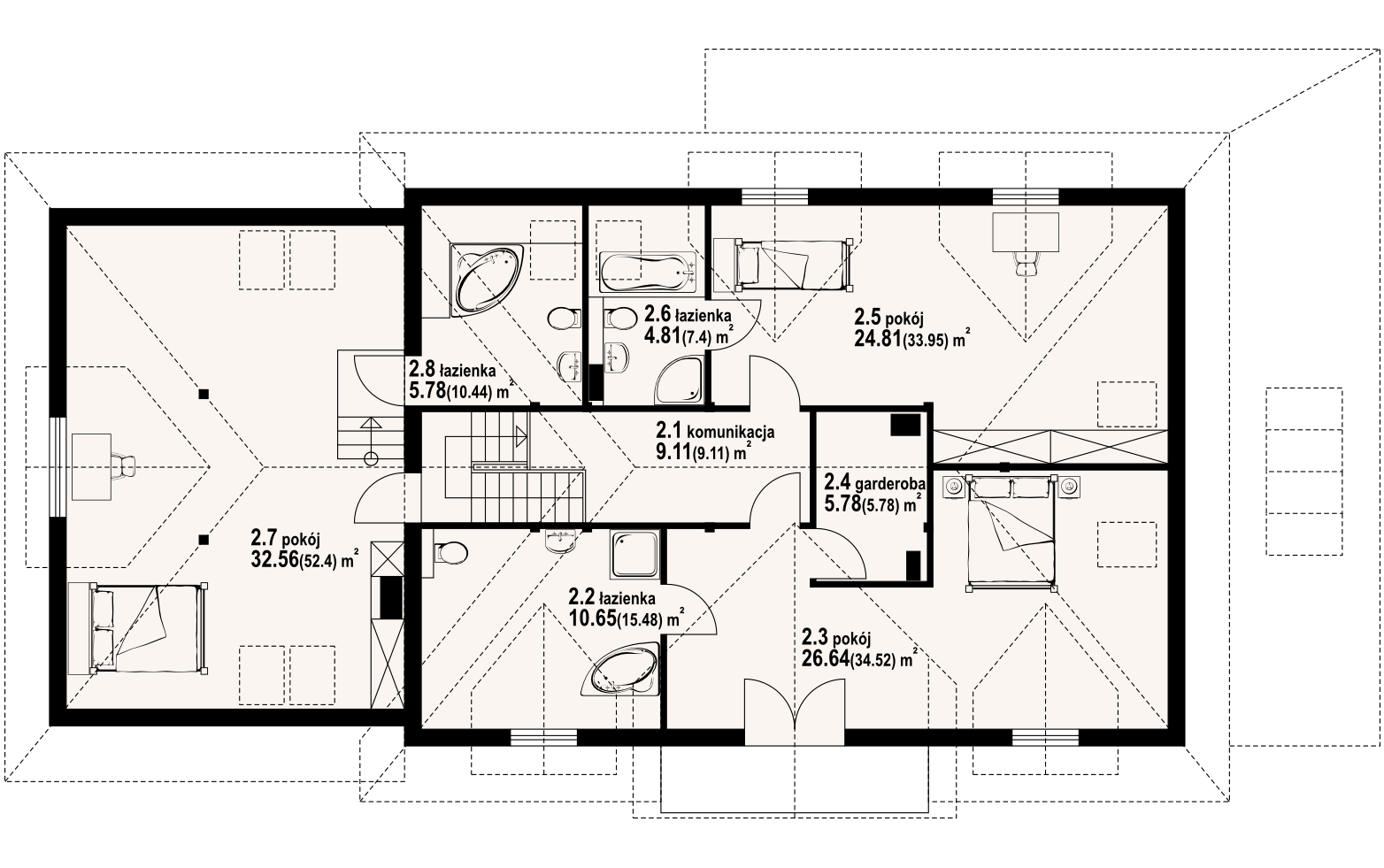 Dom w konstrukcji szkieletu drewnianego. Duży salon z aneksem kuchennym, kominkiem i wyjściem na taras. Pokój, łazienka, pralnia, komunikacja, spiżarka, wiatrołap. Garaż i kotłownia. Na poddaszu trzy pokoje, trzy łazienka, garderoba, komunikacja i balkon.