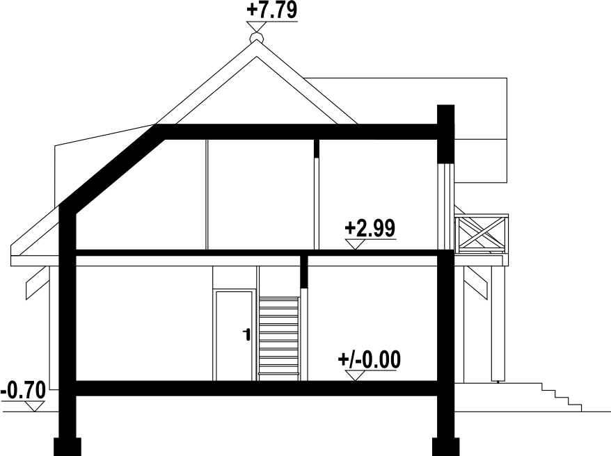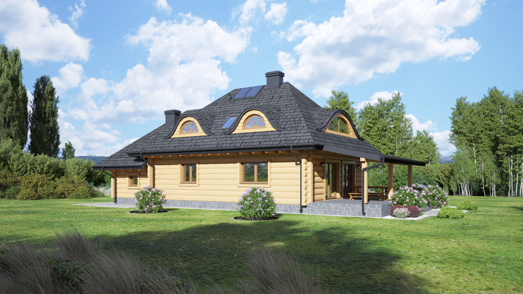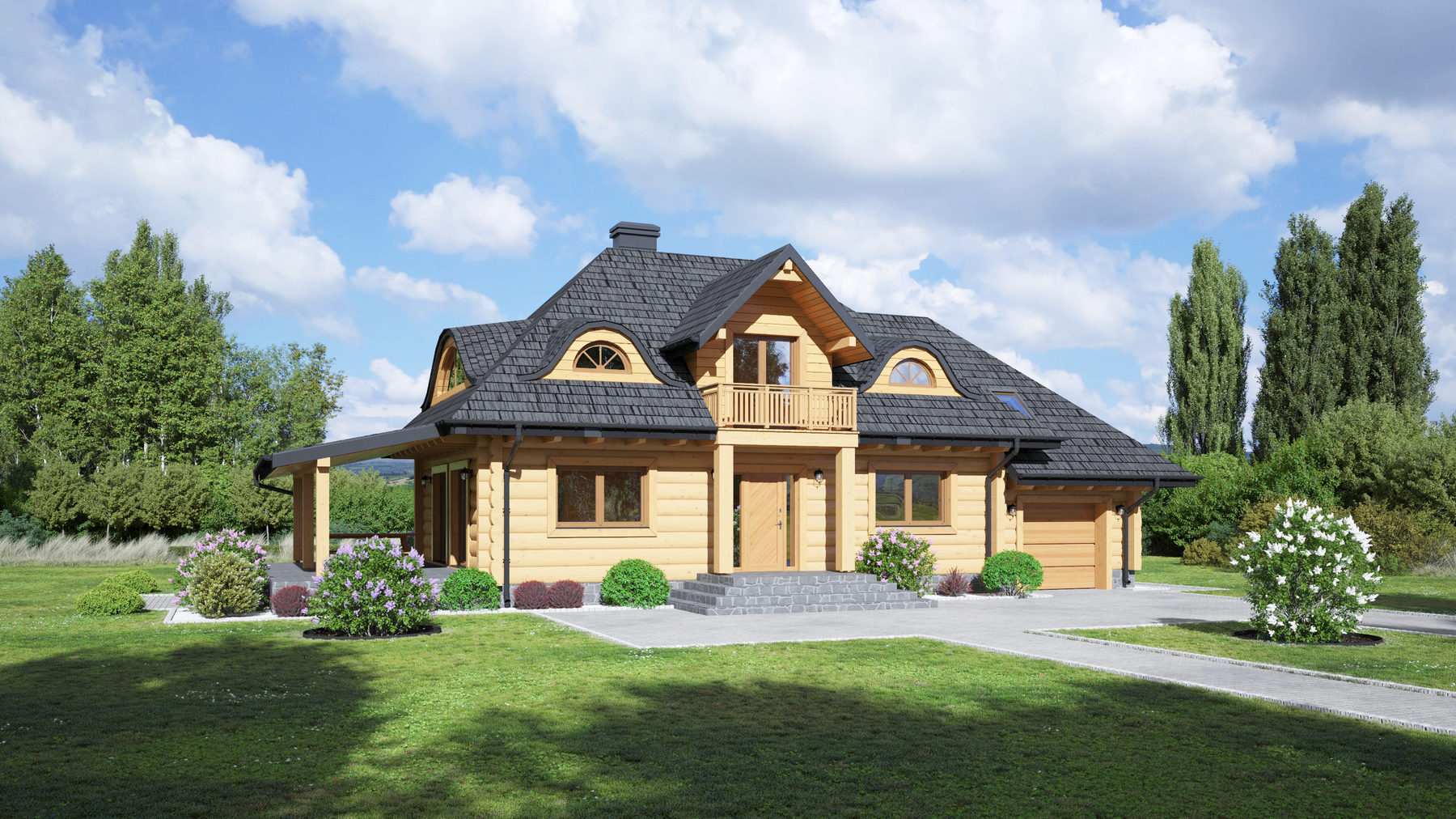 Dom z bali drewnianych. Na parterze salon z kominkiem i wyjściem na zadaszony taras. Częściowo wydzielona, duża kuchnia, pokój, łazienka, korytarz, wiatrołap, garaż oraz pomieszczenie gospodarcze. Na poddaszu trzy pokoje, jeden z nich z własną łazienką, garderobą oraz wyjściem na balkon. Dodatkowa łazienka, garderoba oraz korytarz.
