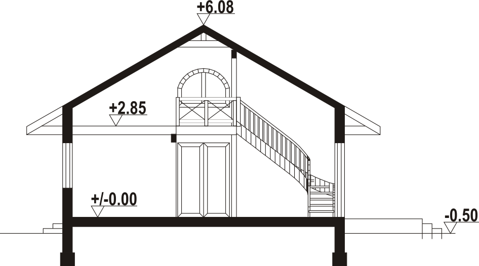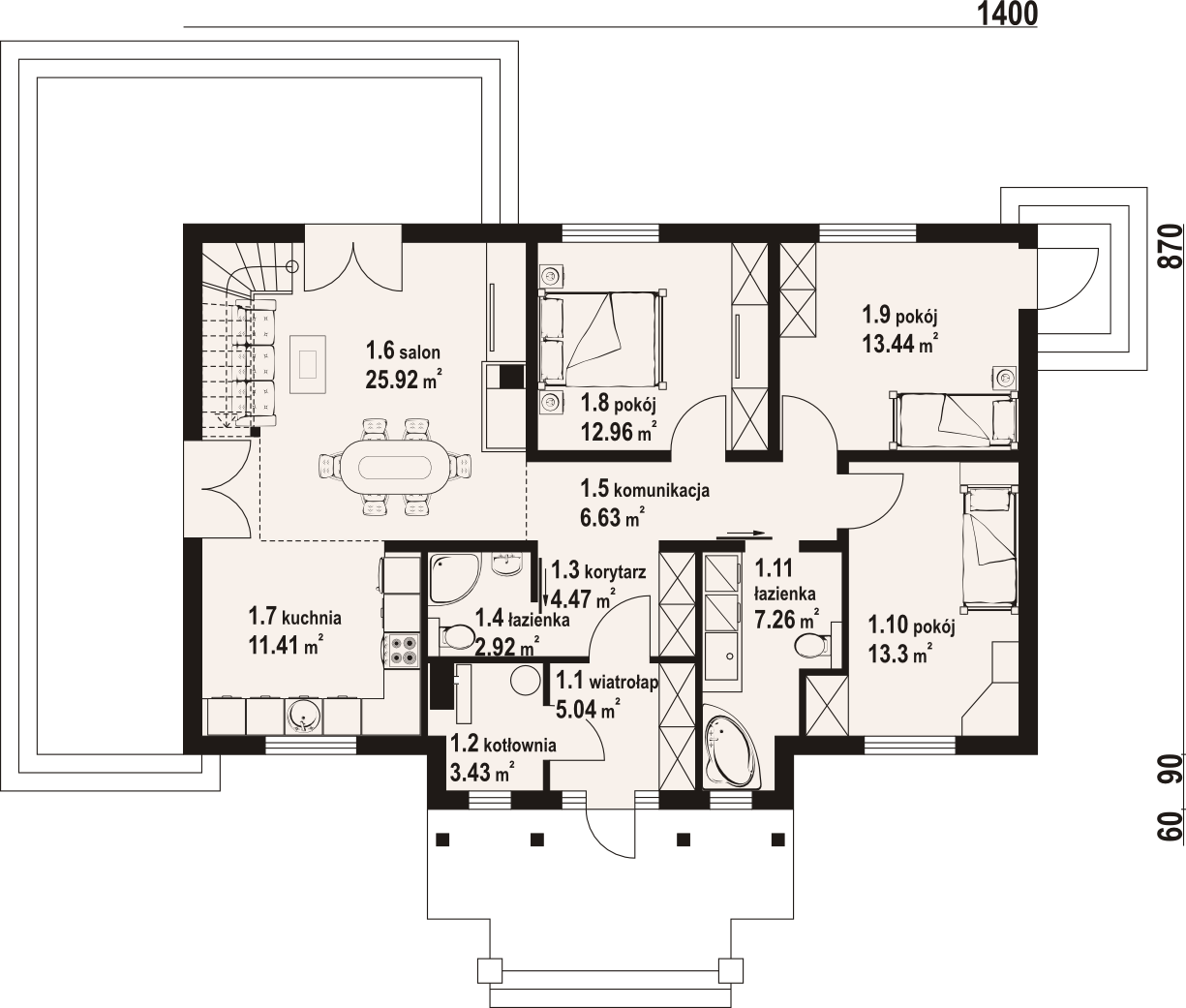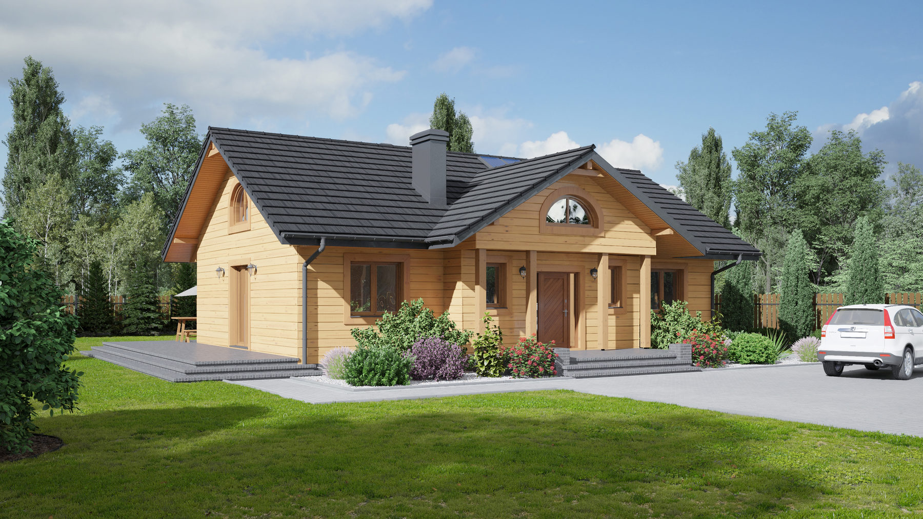 Dom w konstrukcji szkieletowej. Parterowy. Duży salon z aneksem kuchennym, kominkiem i wyjściami na taras. Nad częścią salonu strop wycięty, a na poddaszu antresola. Trzy pokoje, dwie łazienki, wiatrołap, korytarz, komunikacja i kotłownia. Na poddaszu antresola, pustka nad salonem i strych. Zwarta bryła budynku i dach dwuspadowy sprzyjają szybkiej i taniej budowie i niskim kosztom eksploatacji.