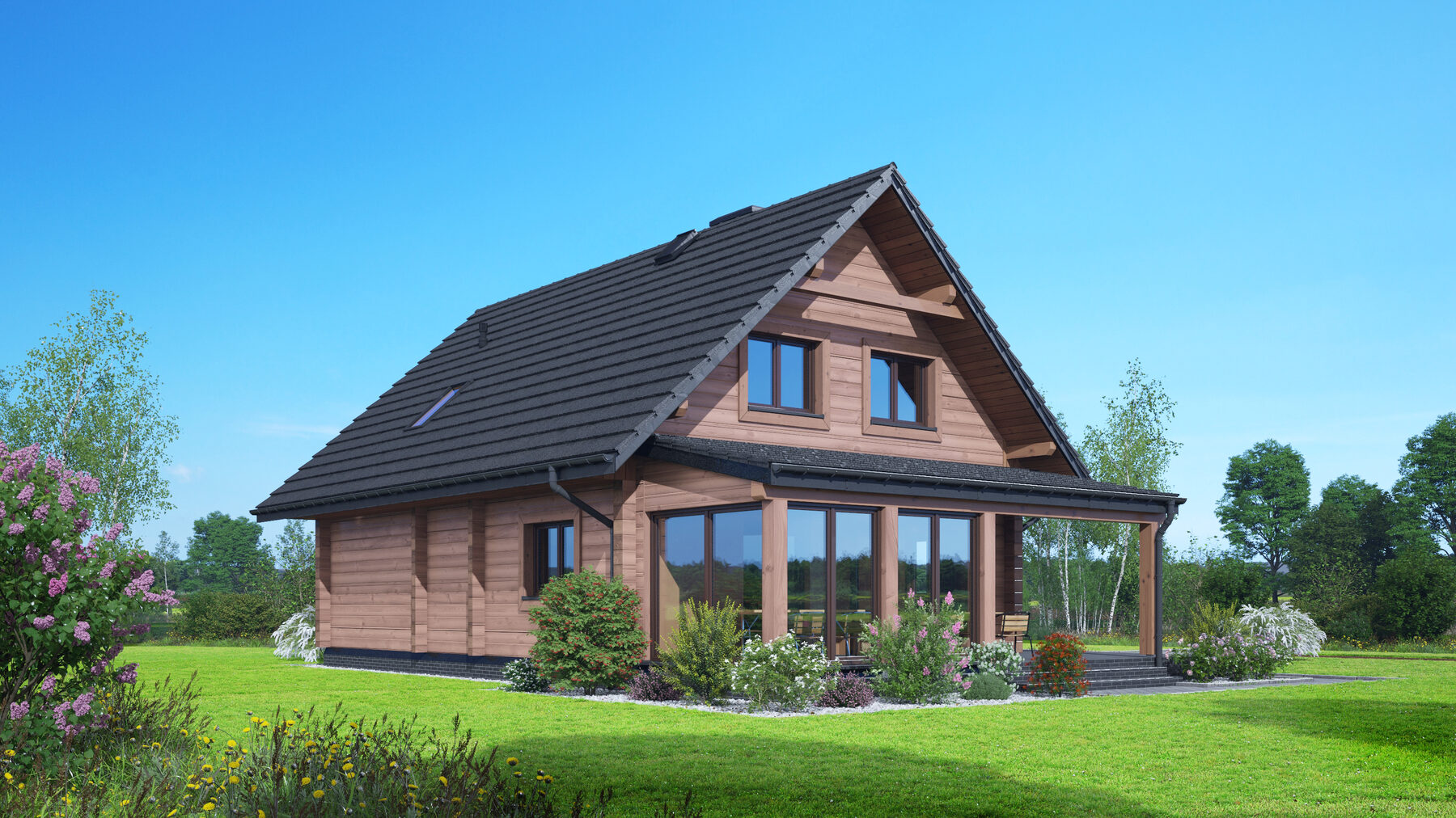 Dom z bali. Na parterze salon z kuchnią, kominkiem, wyjściem na zadaszony taras oraz przejściem do ogrodu zimowego. Pokój-gabinet, łazienka, pomieszczenie gospodarcze, wiatrołap, komunikacja, schowek pod schodami. Na poddaszu trzy pokoje, dwie garderoby, łazienka, pralnia, komunikacja oraz balkon. Zwarta bryła budynku oraz dach dwuspadowy sprzyjają szybkiej i taniej budowie oraz niskim kosztom eksploatacji.