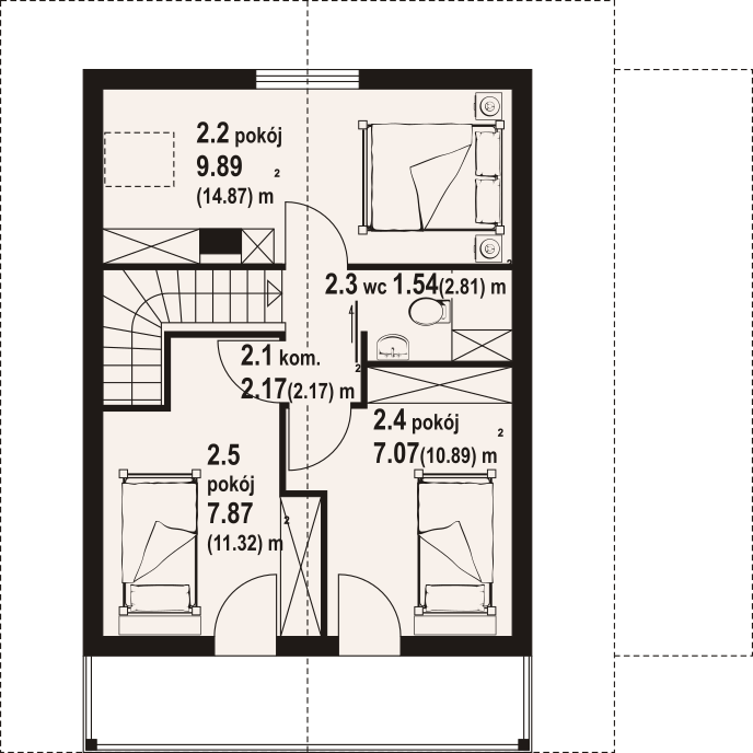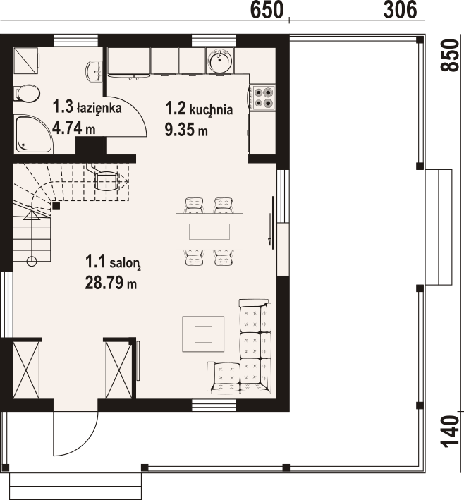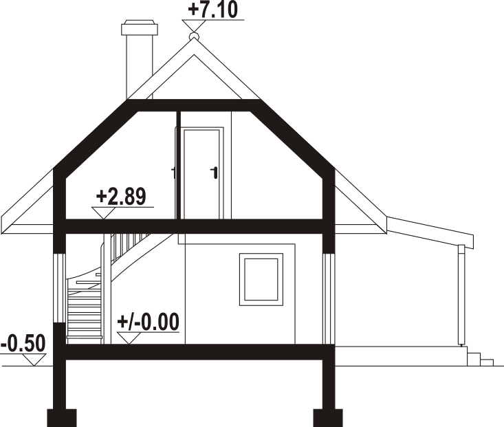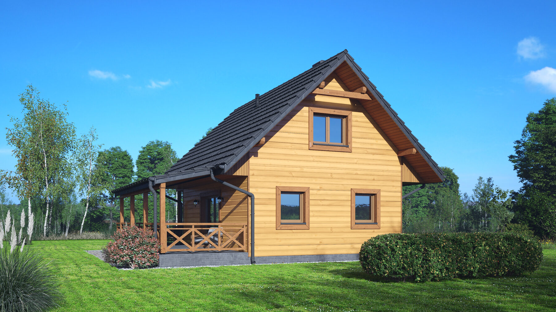 Dom w konstrukcji szkieletu drewnianego. Na parterze salon z kuchnią, kominkiem, wyjściem na duży, zadaszony taras oraz łazienka. Na poddaszu trzy pokoje, wc, komunikacja oraz balkon dostępny z dwóch pokoi. Zwarta bryła budynku i dach dwuspadowy sprzyjają szybkiej i taniej budowie oraz niskim kosztom eksploatacji.