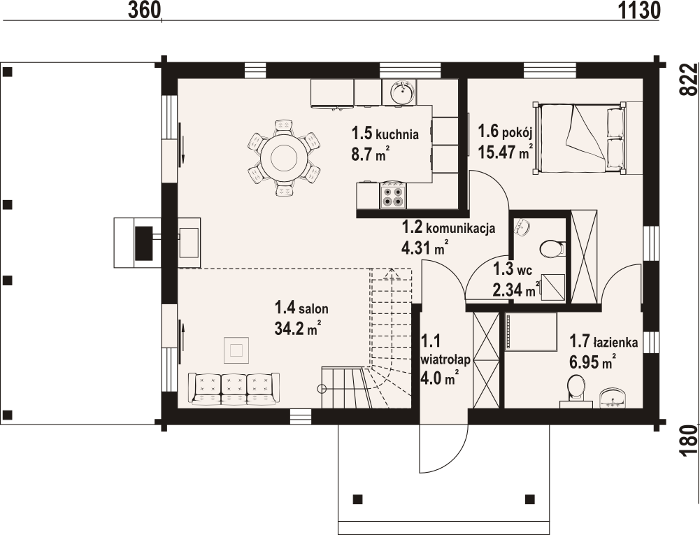 Dom w konstrukcji szkieletu drewnianego. Duży salon z aneksem kuchennym, kominkiem, wyjściami na zadaszony taras i schodami na poddasze. Pokój, łazienka, wc, komunikacja i wiatrołap. Na poddaszu dwa pokoje, łazienka, strych, komunikacja i pustka nad częścią salonu. Zwarta bryła budynku i dach dwuspadowy sprzyjają szybkiej i taniej budowie i niskim kosztom eksploatacji.