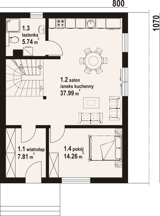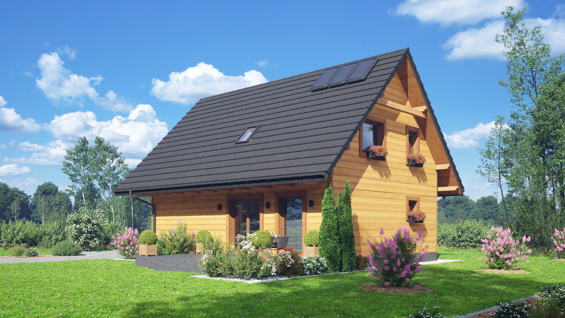Dom w konstrukcji szkieletu drewnianego. Na parterze salon z aneksem kuchennym, wyjściem na taras i schodami na poddasze. Pokój, łazienka, wiatrołap. Na poddaszu trzy pokoje, garderoba, komunikacja, łazienka oraz balkon dostępny z dwóch pokoi. Zwarta bryła budynku oraz dach dwuspadowy sprzyjają szybkiej i taniej budowie oraz niskim kosztom eksploatacji.