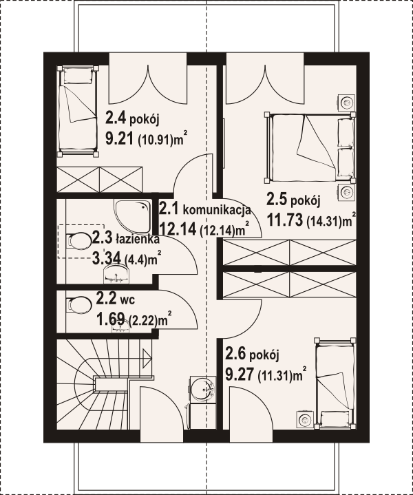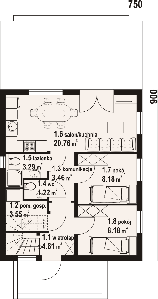 Dom w konstrukcji szkieletu drewnianego. Salon z aneksem kuchennym i wyjściem na taras. Dwa pokoje, łazienka, wc, wiatrołap i pomieszczenie gospodarcze.Na poddaszu trzy pokoje, łazienka, wc, komunikacja i dwa balkony. Zwarta bryła budynku i dach dwuspadowy sprzyjają szybkiej i taniej budowie i niskim kosztom eksploatacji.