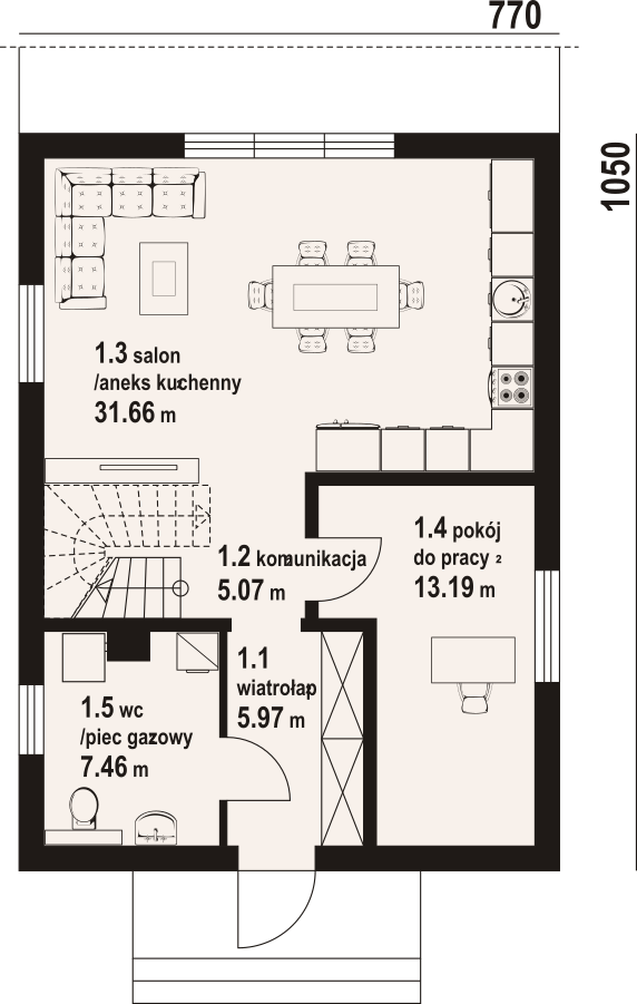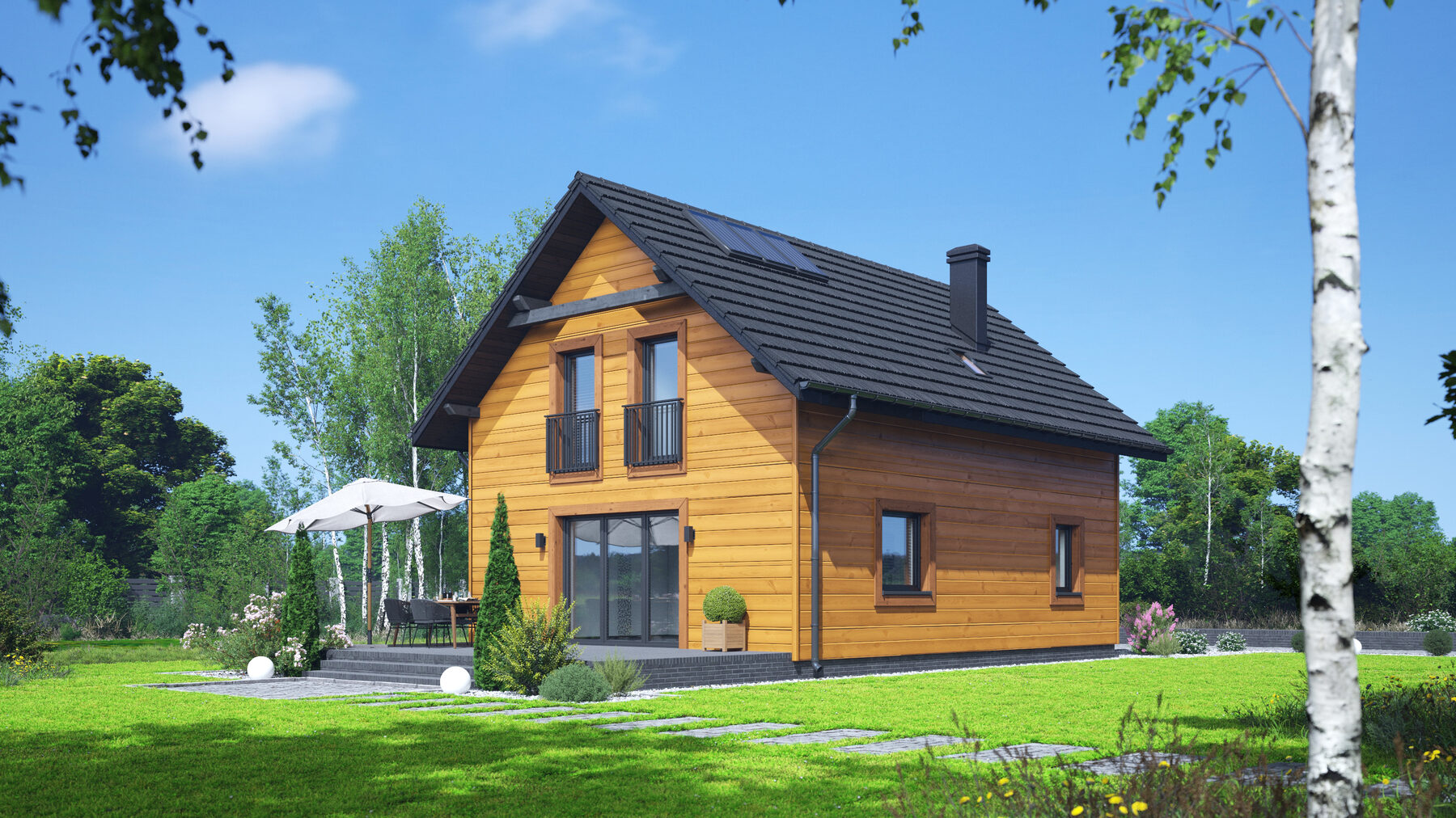 Dom w konstrukcji szkieletu drewnianego. Na parterze salon z aneksem kuchennym, wyjściem na taras i schodami na poddasze. Pokój do pracy, komunikacja, wiatrołap, wc z piecem gazowym. Na poddaszu trzy pokoje, łazienka, komunikacja, garderoba. Zwarta bryła budynku oraz dach dwuspadowy sprzyjają szybkiej i taniej budowie oraz niskim kosztom eksploatacji