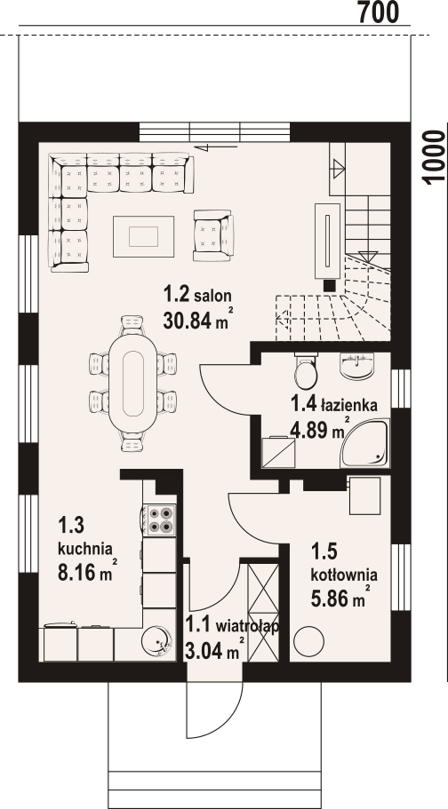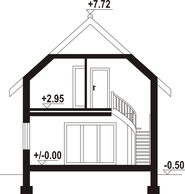 Dom w konstrukcji szkieletu drewnianego. Na parterze salon z aneksem kuchennym, wyjściem na taras i schodami na poddasze. Wiatrołap, kotłownia, łazienka. Na poddaszu cztery pokoje, łazienka, komunikacja oraz balkon. Zwarta bryła budynku oraz dach dwuspadowy sprzyjają szybkiej i taniej budowie oraz niskim kosztom eksploatacji.