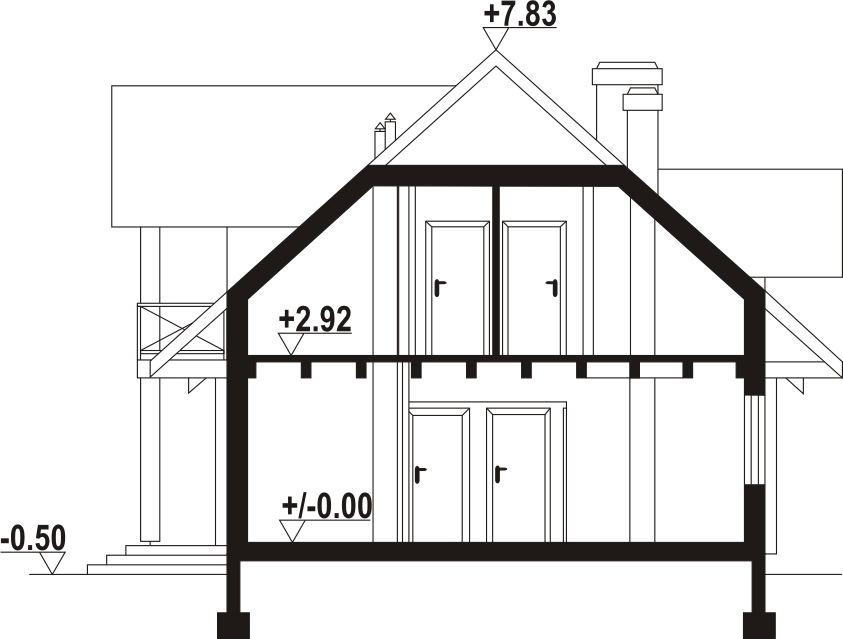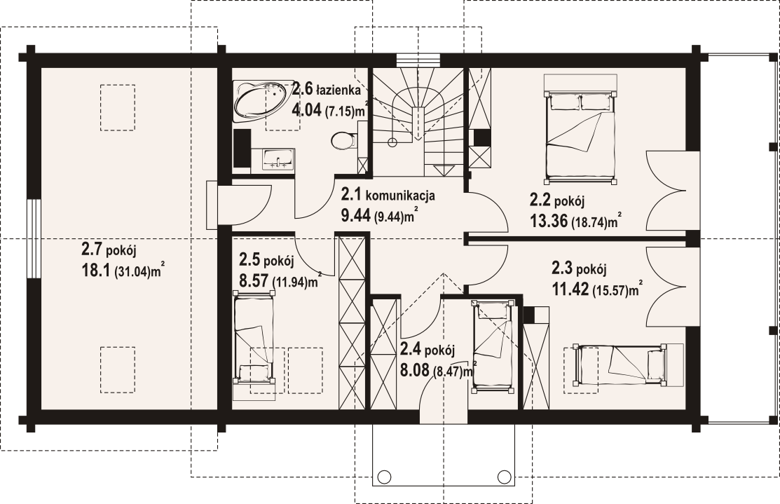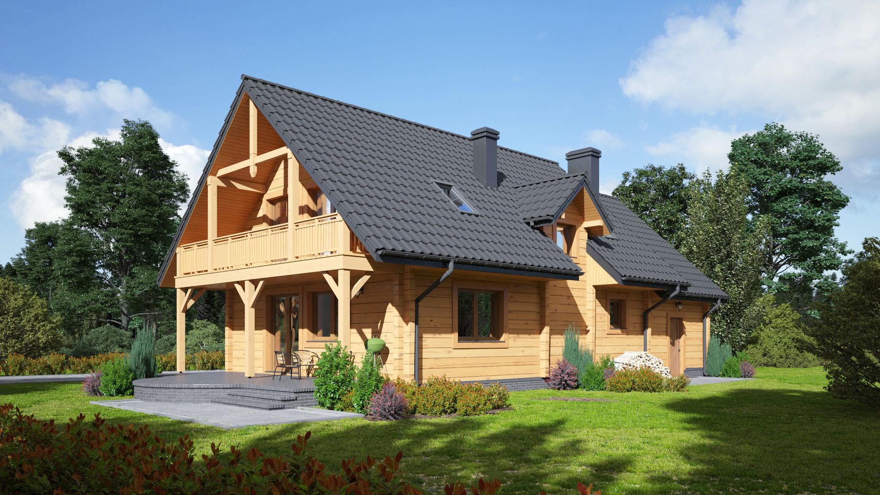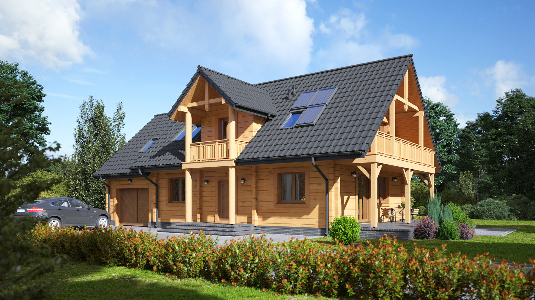 Dom z bali. Duży salon z aneksem kuchennym, kominkiem i wyjściem na zadaszony taras. Pokój, łazienka, komunikacja, wiatrołap, garaż i kotłownia. Na poddaszu pięć pokoi, łazienka, komunikacja, dwa balkony. Instalacja solarna. Zwarta bryła budynku i dach dwuspadowy sprzyjają szybkiej i taniej budowie i niskim kosztom eksploatacji