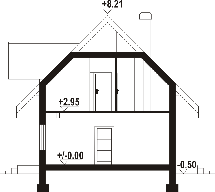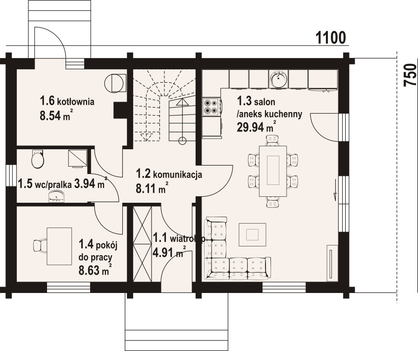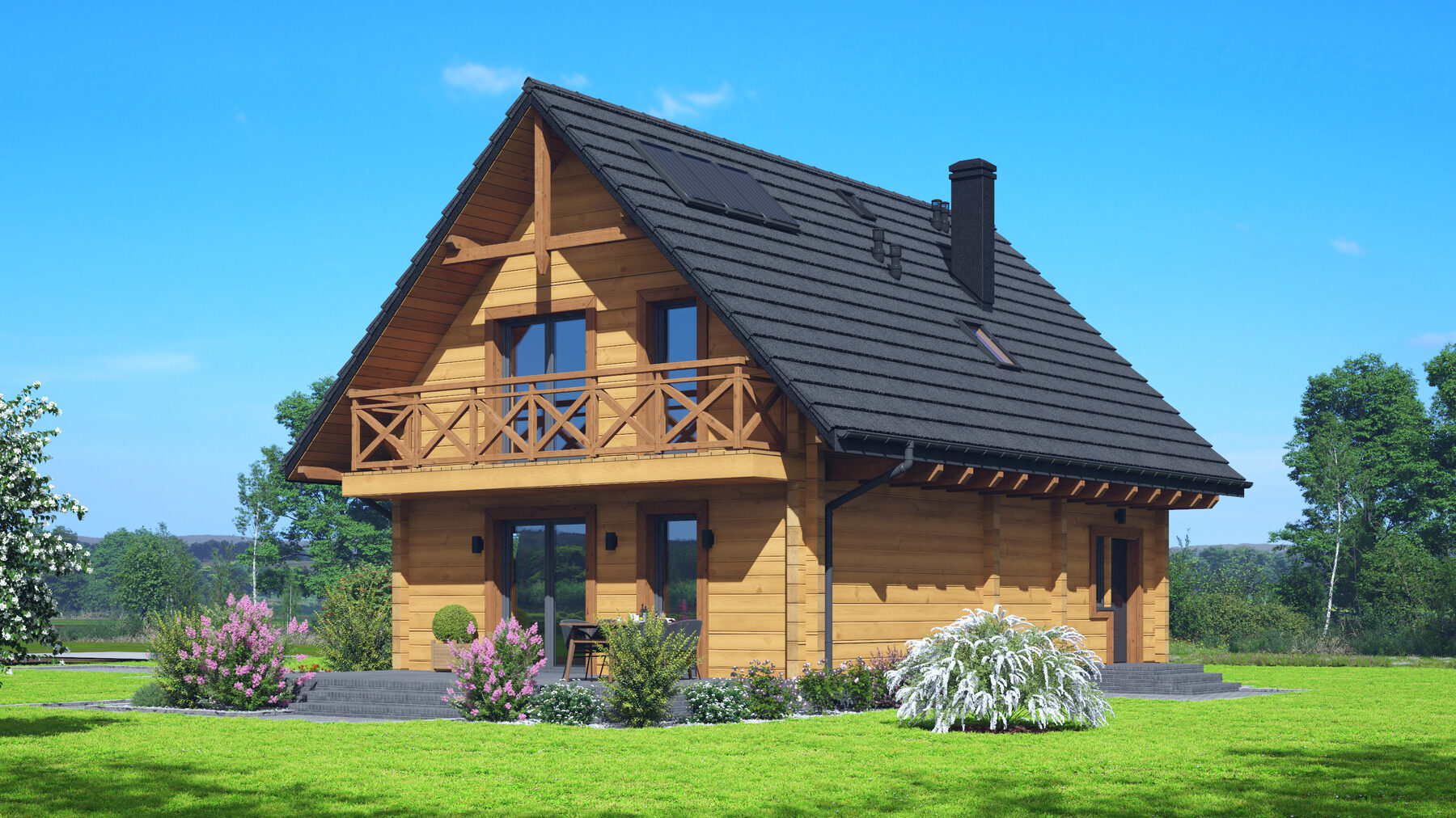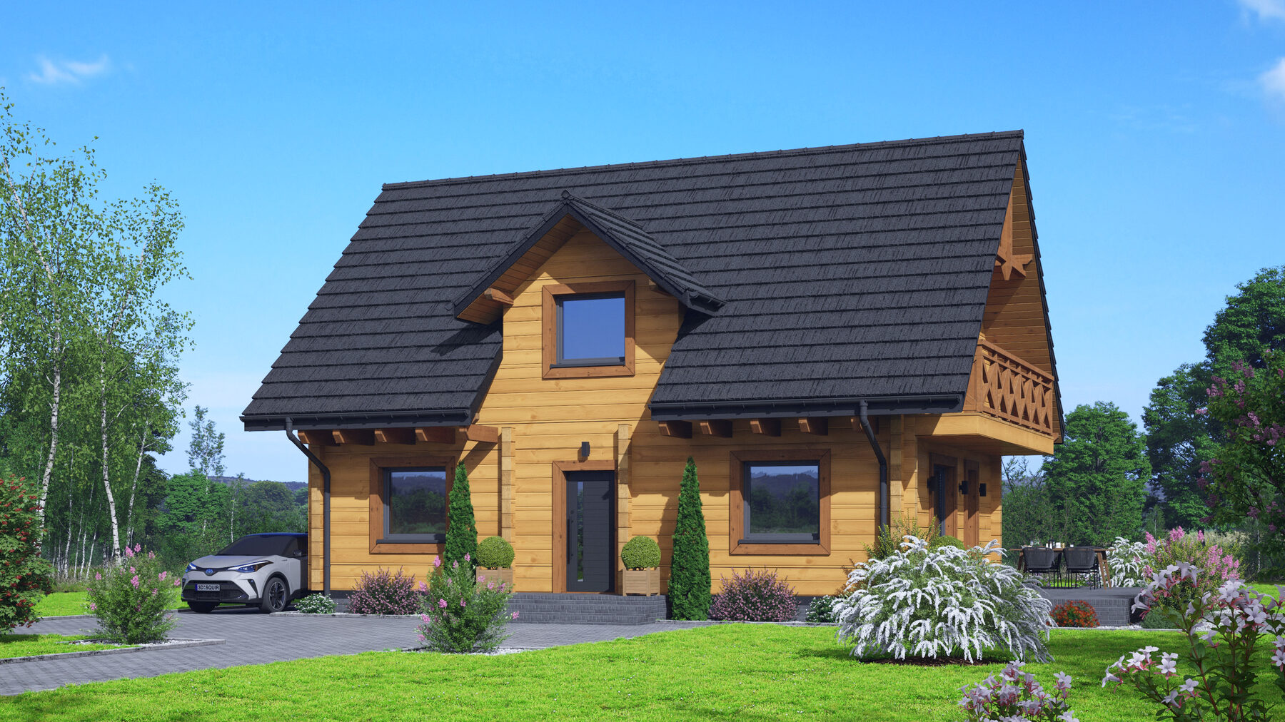 Dom z bali. Na parterze salon z aneksem kuchennym oraz wyjściem na taras. Pokój do pracy, wc z pralką, kotłownia, komunikacja, wiatrołap. Na poddaszu cztery pokoje, komunikacja, łazienka. Zwarta bryła budynku oraz dach dwuspadowy sprzyjają szybkiej i taniej budowie oraz niskim kosztom eksploatacji.