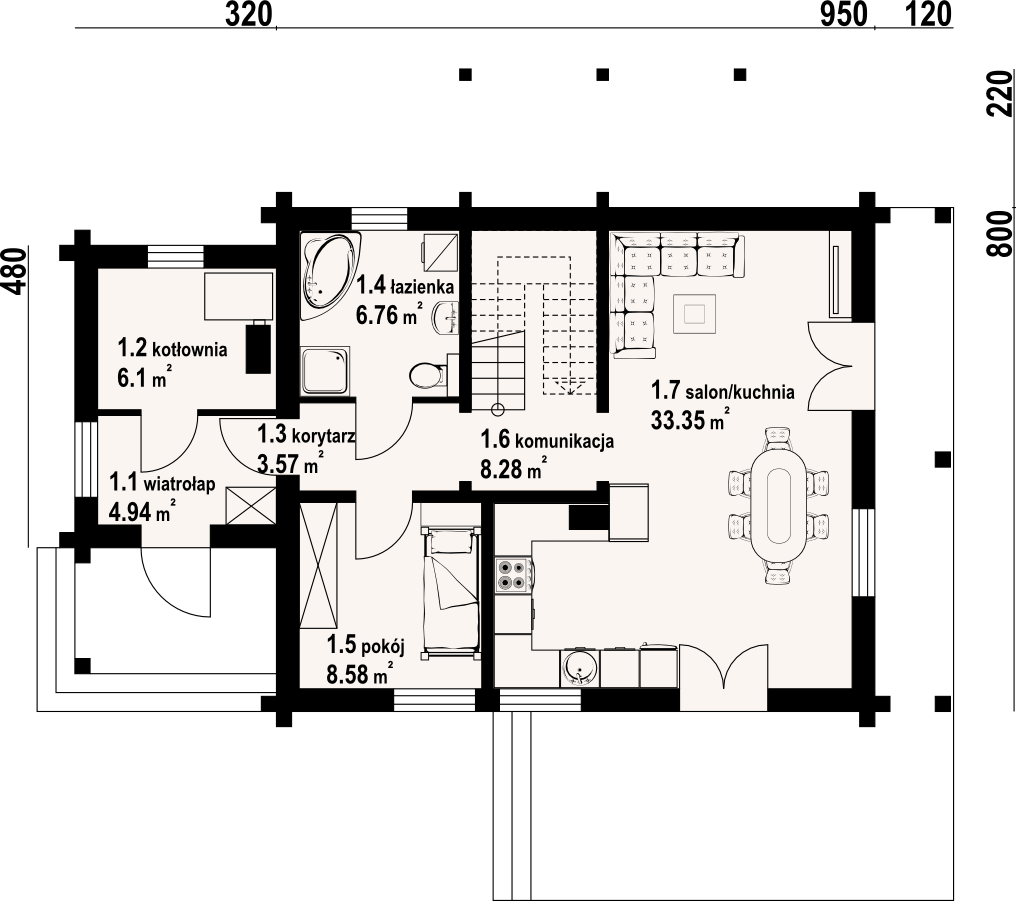 Dom z bali drewnianych. Duży salon z aneksem kuchennym, kominkiem i wyjściem na taras. Pokój, komunikacja, wiatrołap i kotłownia. Na poddaszu cztery pokoje, łazienka, komunikacja i balkon. Zwarte bryła budynku i dach dwuspadowy sprzyjają szybkiej i taniej budowie oraz niskim kosztom eksploatacji.
