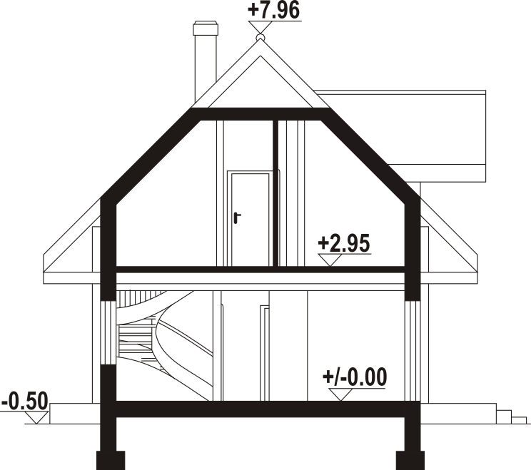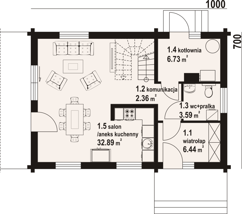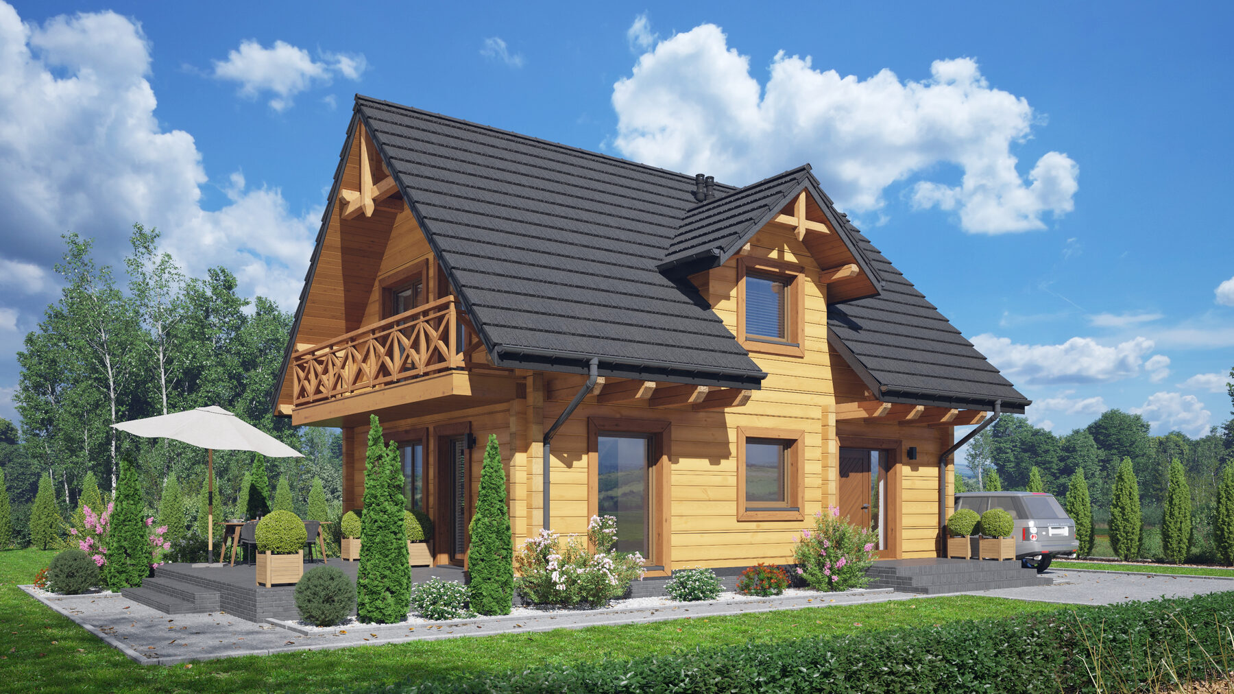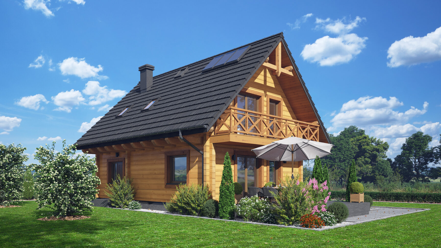 Dom z bali. Na parterze salon z aneksem kuchennym, wyjściem na taras i schodami na poddasze. Kotłownia, wc z pralką, komunikacja, wiatrołap. Na poddaszu trzy pokoje, łazienka, komunikacja oraz balkon dostępny z dwóch pokoi. Zwarta bryła budynku oraz dach dwuspadowy sprzyjają szybkiej i taniej budowie oraz niskim kosztom eksploatacji.