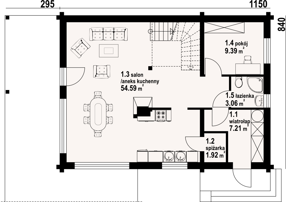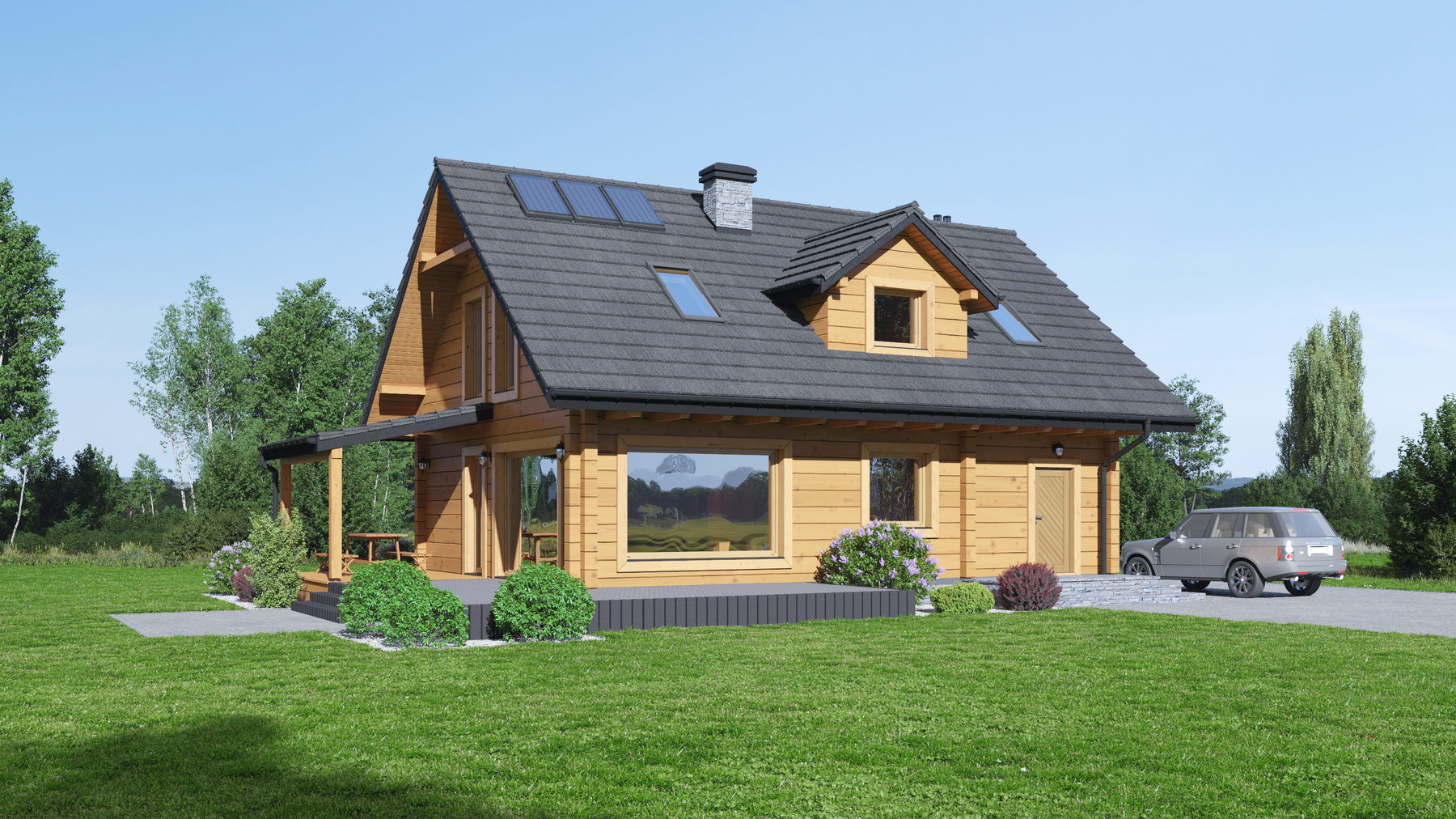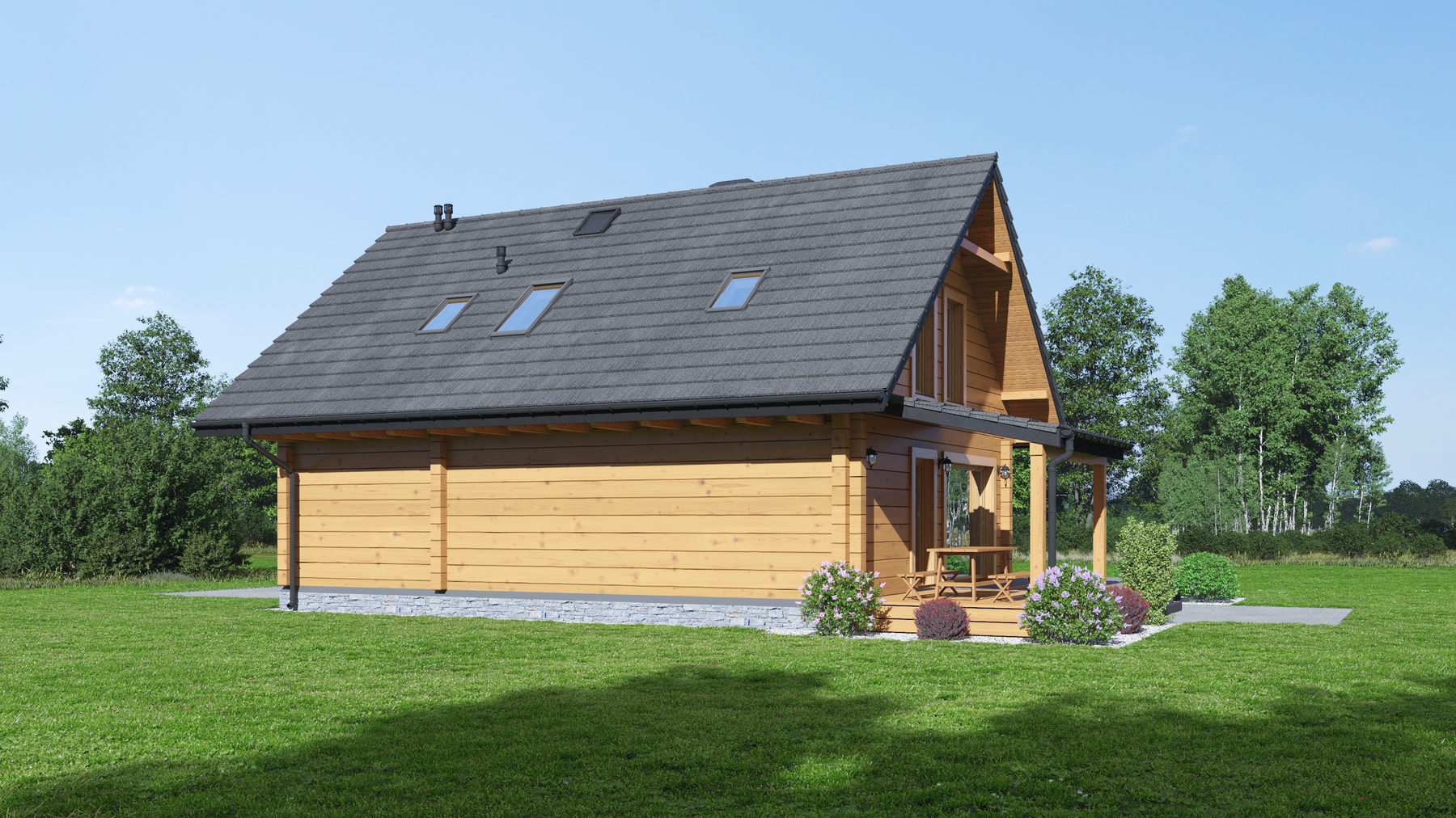 Dom z bali drewnianych. Na parterze duży salon z aneksem kuchennym, kominkiem oraz wyjściem na częściowo zadaszony taras. Pokój, łazienka, wiatrołap, spiżarka. Na poddaszu trzy wygodne pokoje, łazienka, pralnia, garderoba oraz komunikacja. Zwarta bryła budynku oraz dach dwuspadowy sprzyjają szybkiej i taniej budowie oraz niskim kosztom eksploatacji.