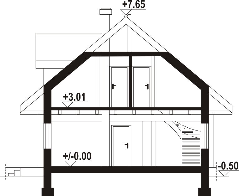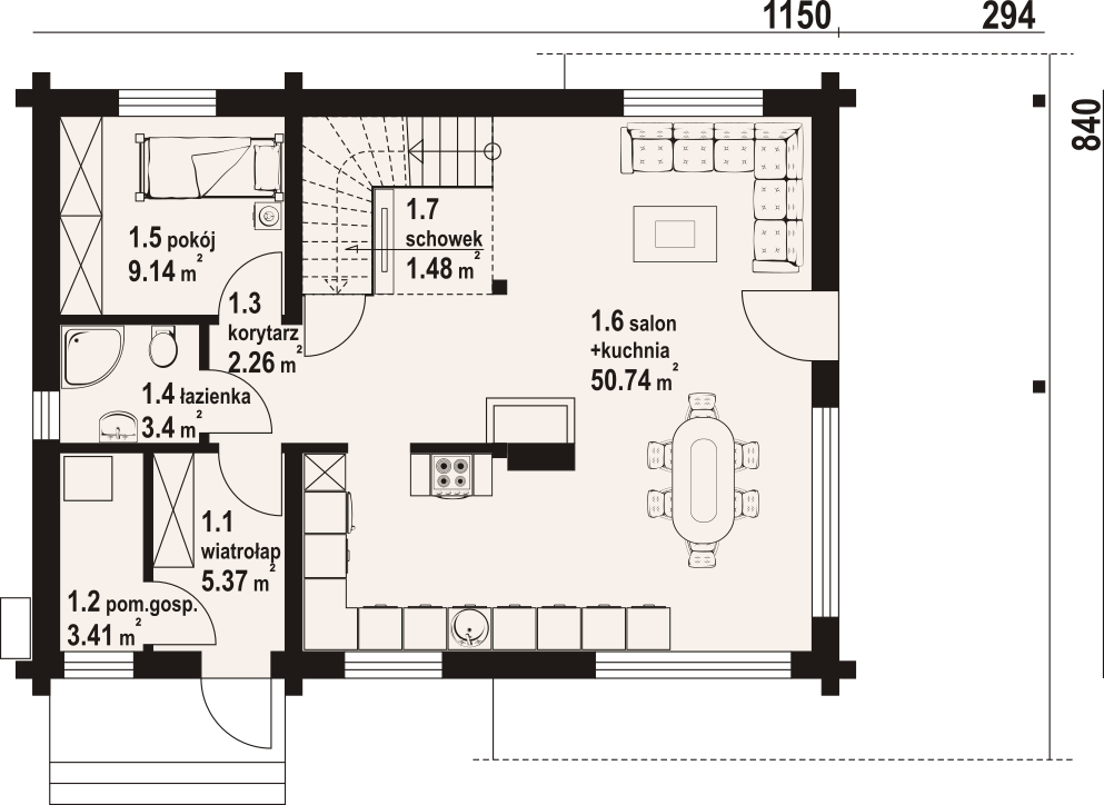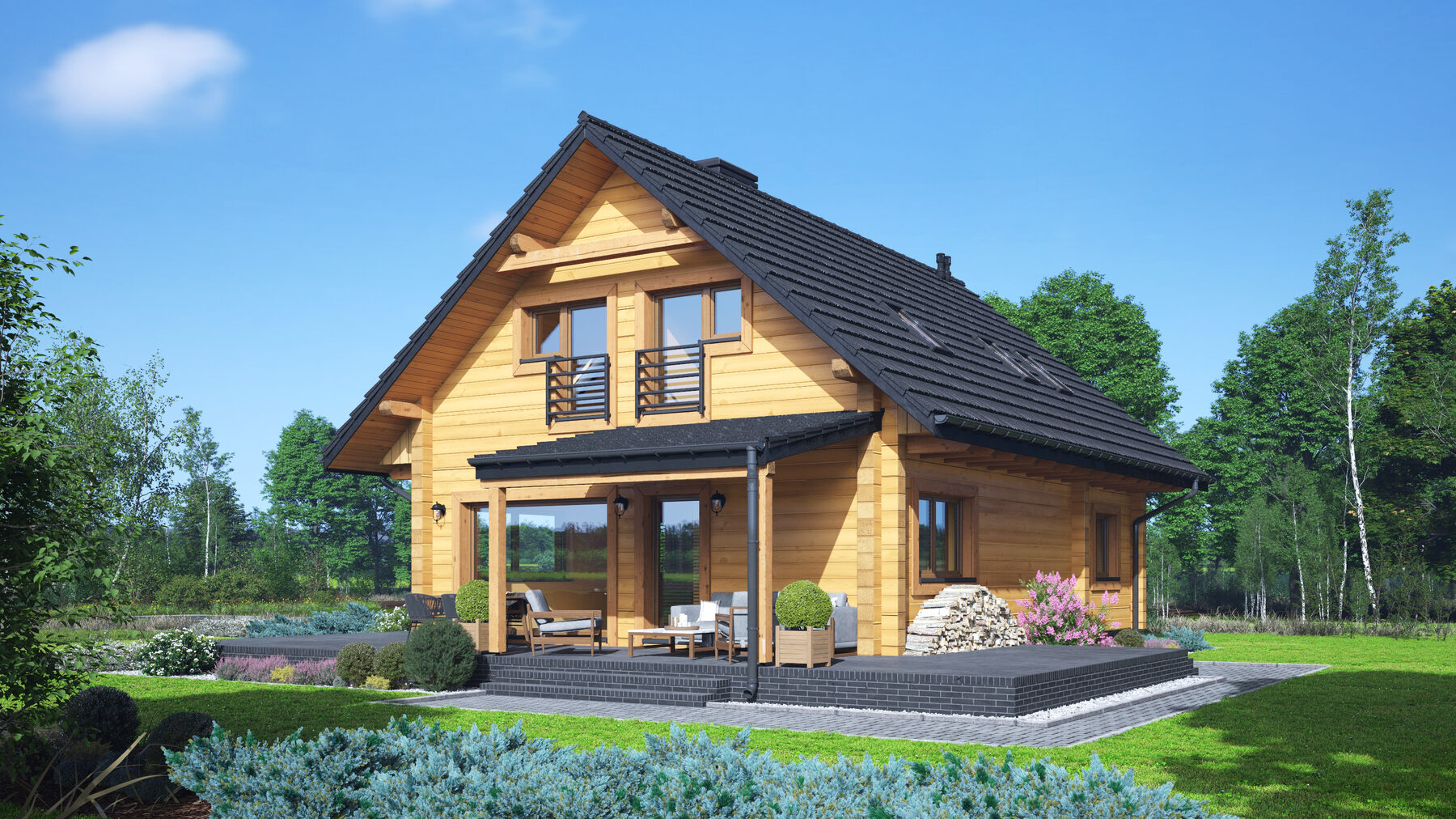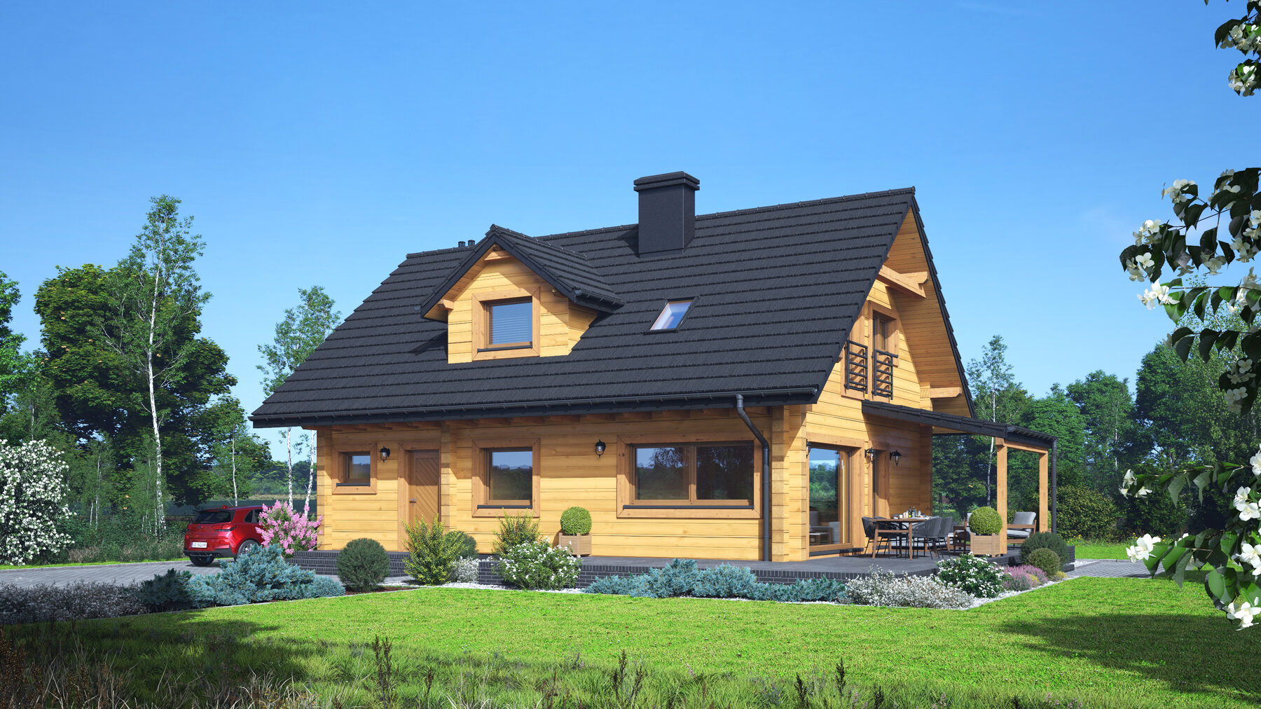 Dom z bali. Na parterze salon z kuchnią, kominkiem, wyjściem na zadaszony taras i schodami na poddasze. Pod schodami schowek. Pokój, łazienka, korytarz, wiatrołap, pomieszczenie gospodarcze. Na poddaszu trzy pokoje, łazienka, komunikacja. Zwarta bryła budynku oraz dach dwuspadowy sprzyjają szybkiej i taniej budowie oraz niskim kosztom eksploatacji.