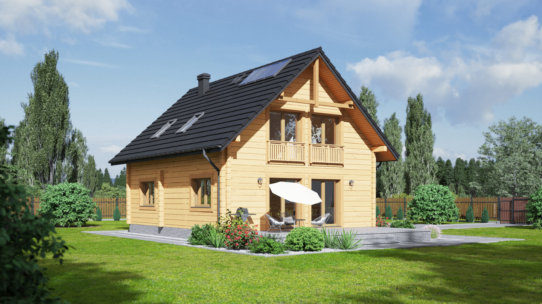 Dom z bali. Duży salon z aneksem kuchennym, wyjściami na taras i schodami na poddasze. Dwa pokoje, łazienka i wiatrołap. Na poddaszu cztery pokoje, łazienka, komunikacja i balkon. Zwarta bryła budynku i dach dwuspadowy sprzyjają szybkiej i taniej budowie i niskim kosztom eksploatacji.