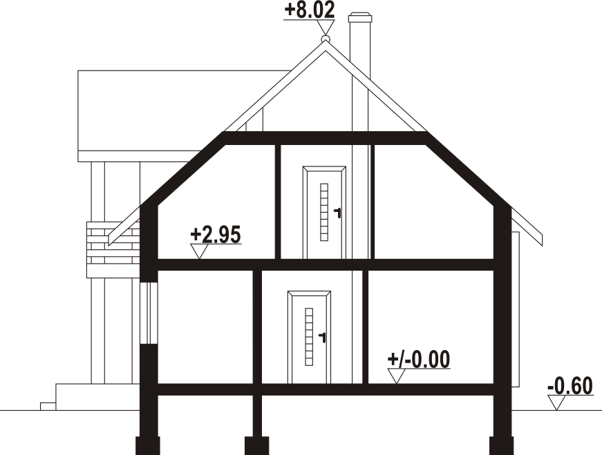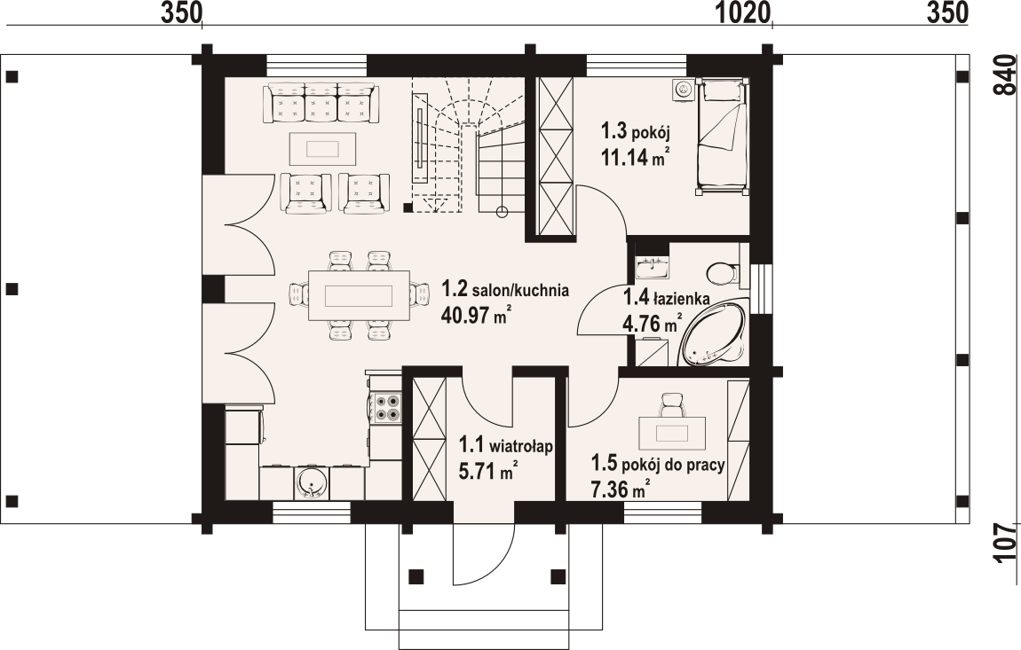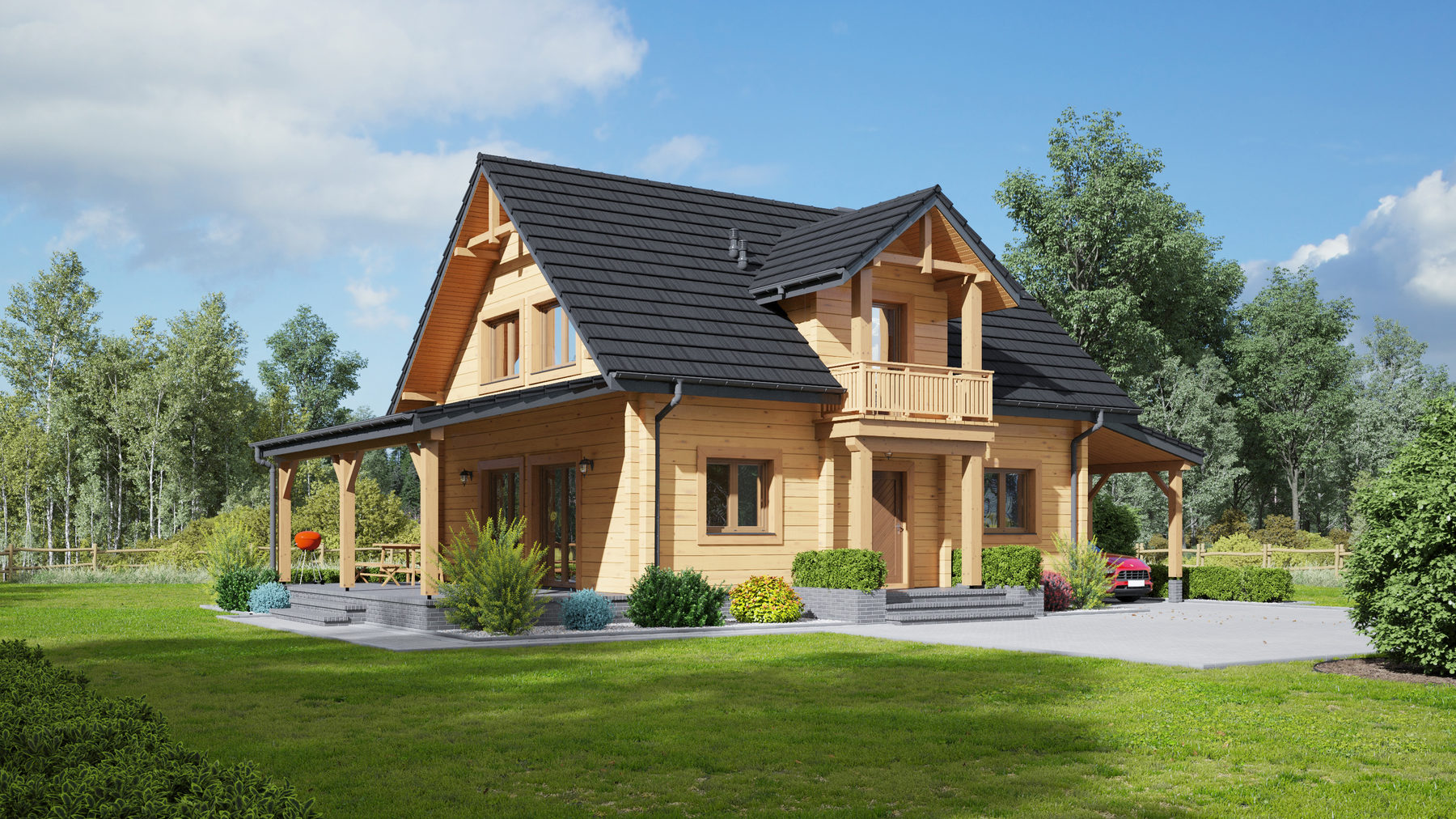 Dom z bali drewnianych. Duży salon z aneksem kuchennym, wyjściami na zadaszony taras i schodami na poddasze. Dwa pokoje, łazienka, wiatrołap. Wiata na samochód. Na poddaszu cztery pokoje, łazienka, komunikacja i balkon. Zwarta bryła budynku i dach dwuspadowy sprzyja szybkiej i taniej budowie i niskim kosztom eksploatacji.