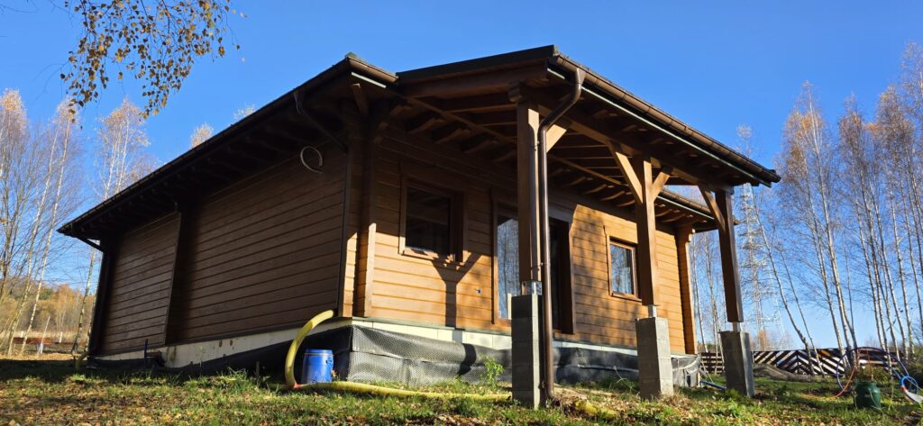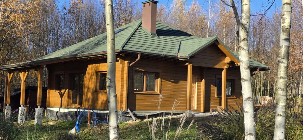Ściana zewnętrzna bal prostokątny 120×180 mm. Ściany domu docelowo zostaną ocieplone wełną mineralną 20 cm (2x10cm) + poszycie ścian. Dom został zaimpregnowany olejami Osmo w kolorze DĄB. Pokrycie dachu Gerard Corona w kolor Sage. Rynny PCV – producent Gamrat. Stolarka okienna PCV w kolorze Złoty Dąb. Komin systemowy firmy Hoch wykończony tynkiem.
