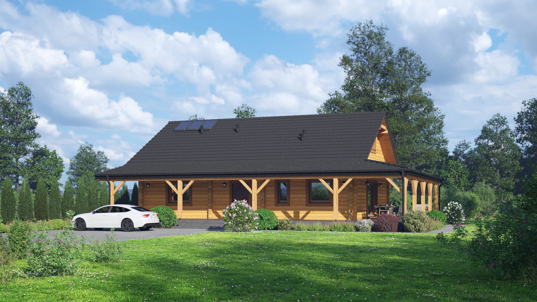 Dom z bali. Parterowy. Salon z aneksem kuchennym, kominkiem oraz wyjściem na duży, zadaszony taras. Trzy pokoje, łazienka, wc, wiatrołap, komunikacja, kotłownia. Wyjście na strych schodami strychowymi składanymi. Zwarta bryła budynku oraz dach dwuspadowy sprzyjają szybkiej i taniej budowie oraz niskim kosztom eksploatacji.