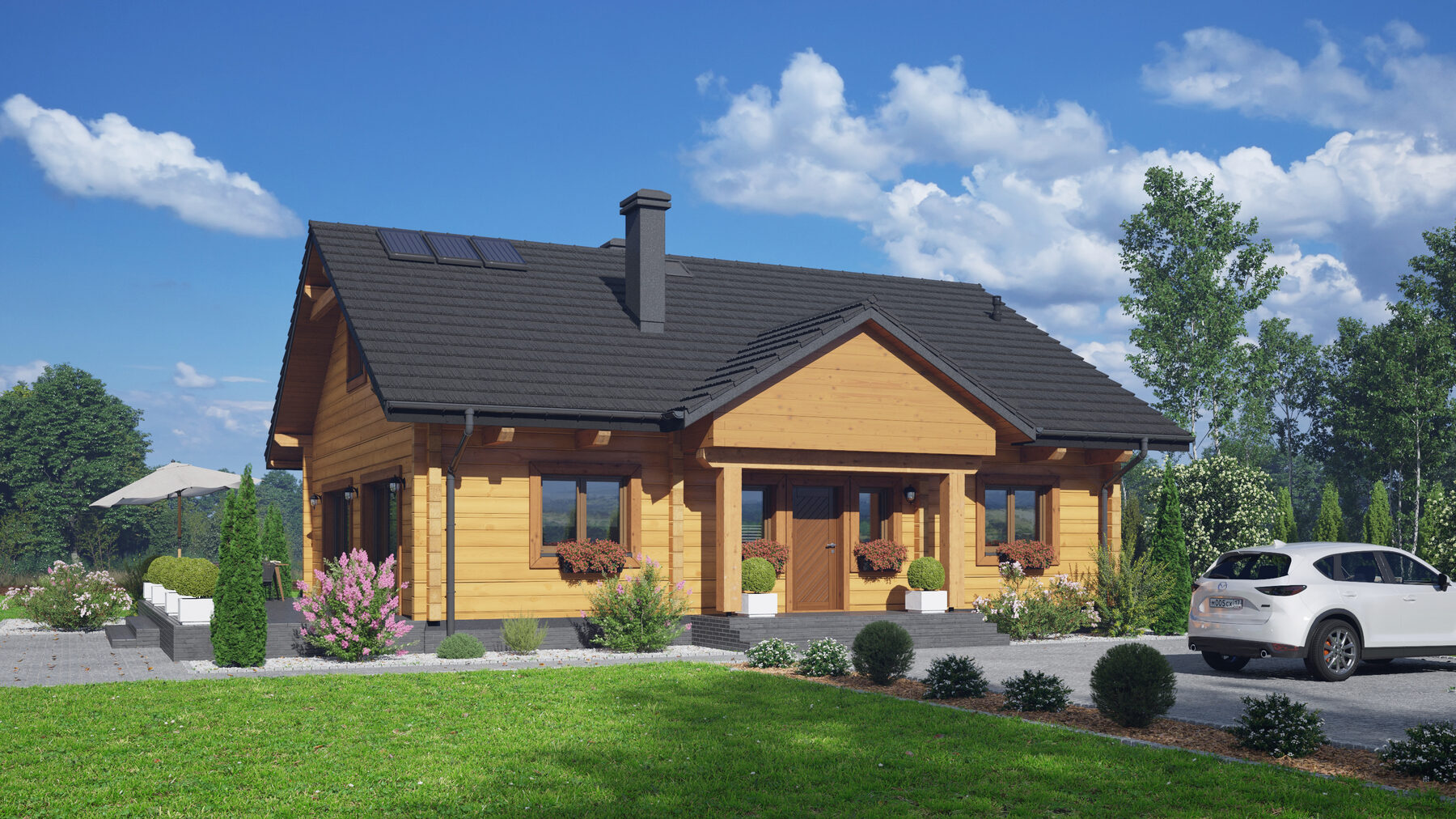 Dom z bali. Parterowy. Salon z aneksem kuchennym, kominkiem oraz wyjściem na taras. Trzy pokoje, łazienka, komunikacja, wiatrołap, kotłownia. Wyjście na poddasze nieużytkowe schodami z wiatrołapu. Zwarta bryła budynku i dach dwuspadowy sprzyjają szybkiej i taniej budowie oraz niskim kosztom eksploatacji.