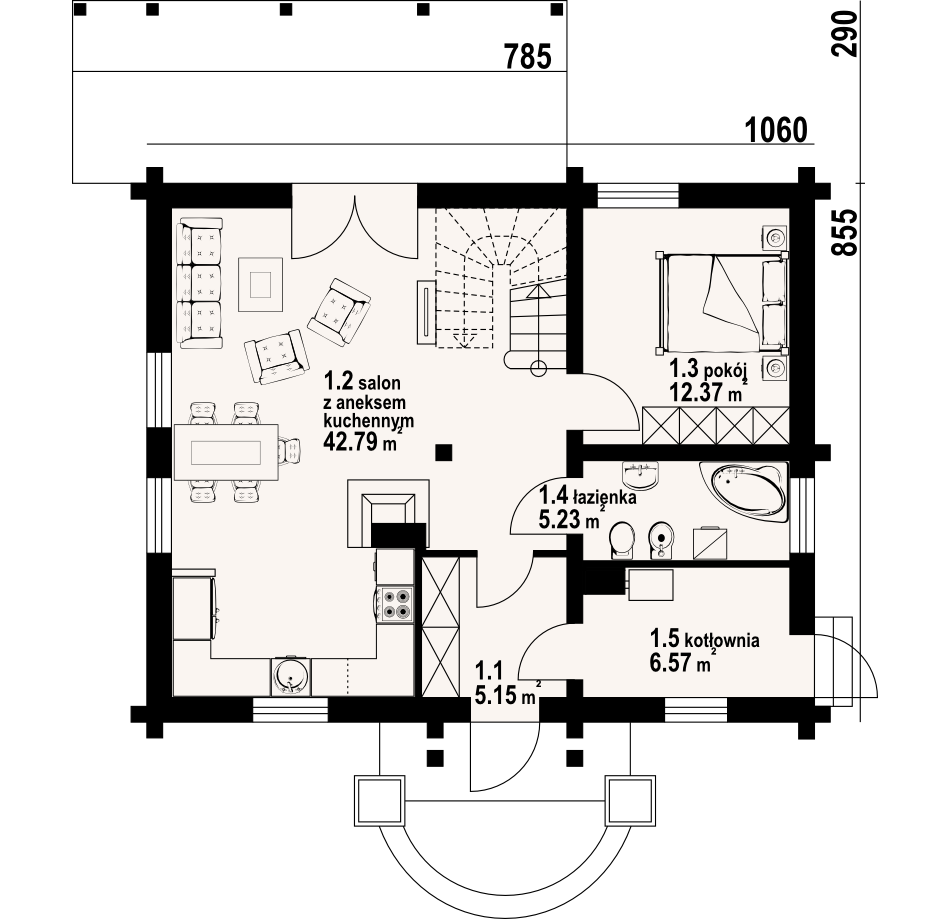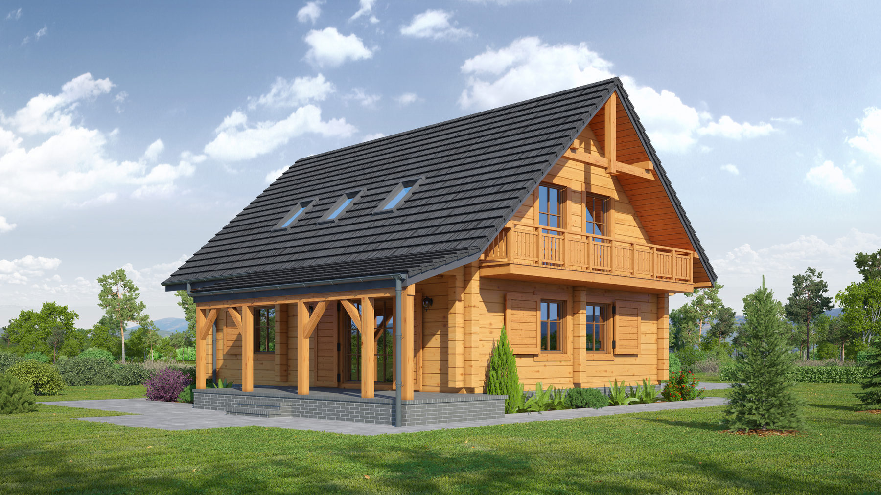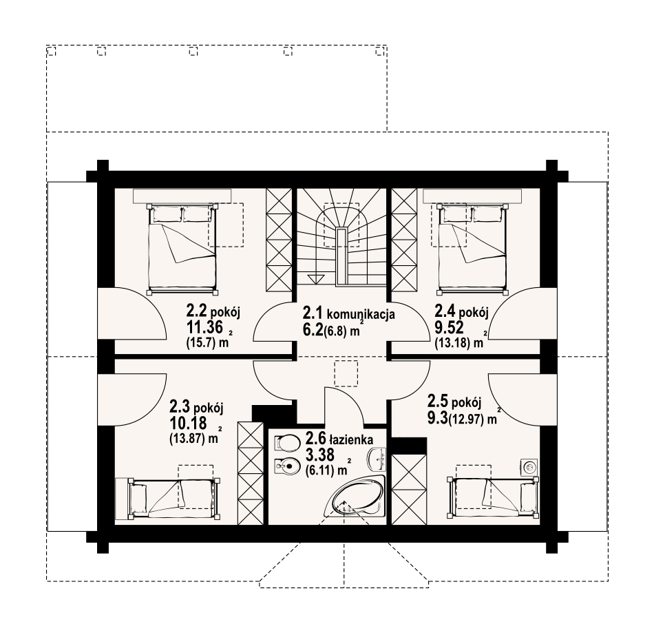 Dom z bali drewnianych. Duży salon z aneksem kuchennym, kominkiem wyjściem na taras i schodami na poddasze. Pokój, łazienka, kotłownia i wiatrołap. Na poddaszu cztery pokoje, łazienka, komunikacja i dwa balkony. Prosta bryła budynku i dach dwuspadowy sprzyjają szybkiej i taniej budowie i niskim kosztom eksploatacji.