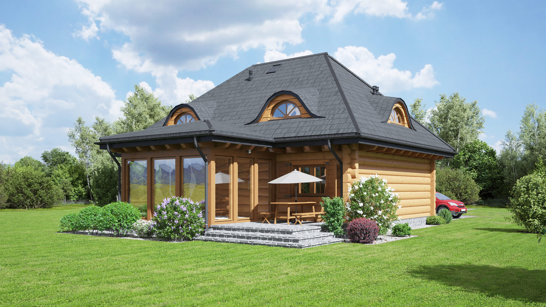 Dom z bali. Na parterze duży salon z kuchnią, kominkiem i wyjściem do ogrodu przez ogród zimowy. Pokój, łazienka, komunikacja i wiatrołap. Na poddaszu trzy pokoje, łazienka, komunikacja, garderoba i balkon.