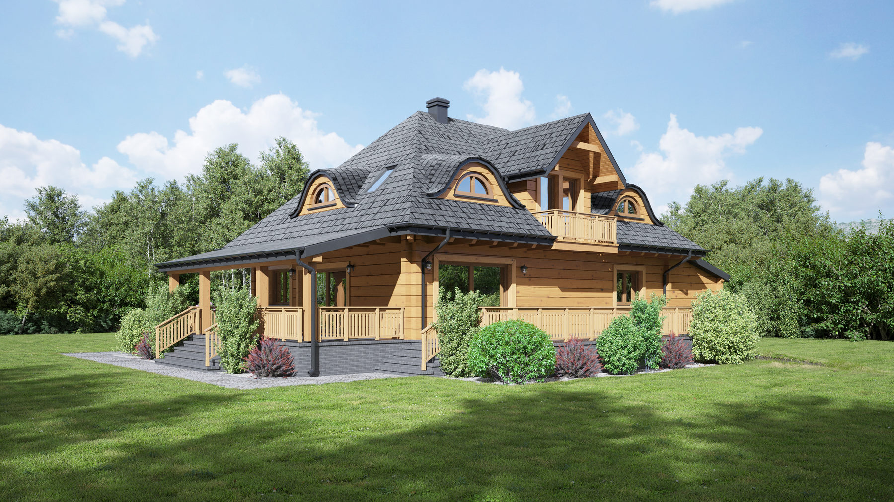Dom z bali drewnianych. Na parterze salon z aneksem kuchennym, kominkiem i wyjściem na zadaszony taras. Pokój, łazienka, spiżarka komunikacja, wiatrołap, korytarz, garaż oraz kotłownia z pralnią. Na poddaszu trzy pokoje, łazienka , komunikacja i balkon.