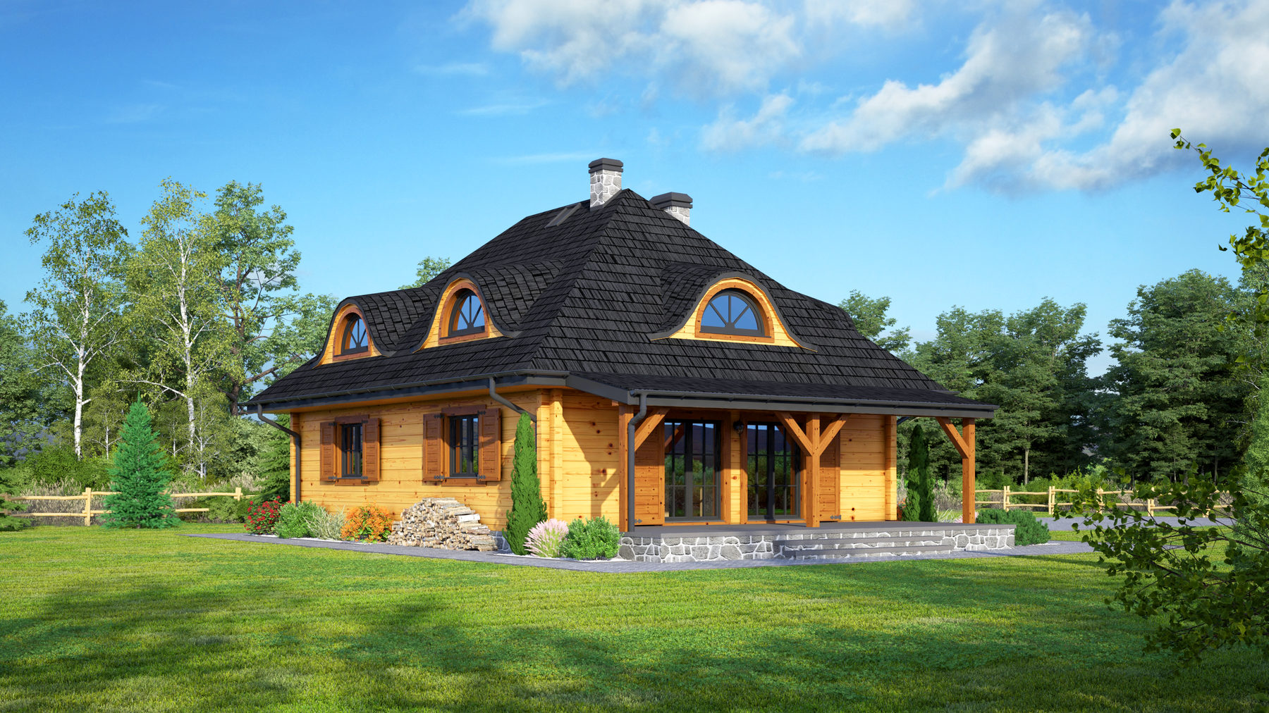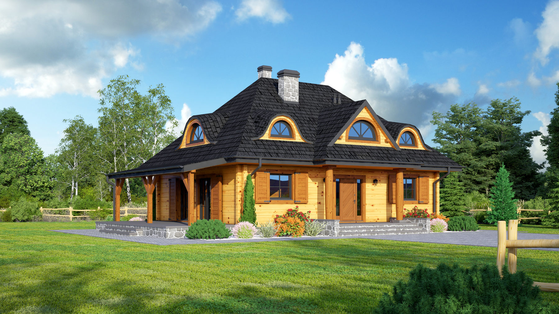 Dom z bali drewnianych. Architektura budynku nawiązuje do tradycji polskiego dworu drewnianego. Duży salon z aneksem kuchennym, kominkiem i wyjściem na zadaszony taras. Pokój, łazienka, wiatrołap, komunikacja, kotłownia. Na poddaszu trzy pokoje, antresola i pustka nad częścią salonu, łazienka i komunikacja.