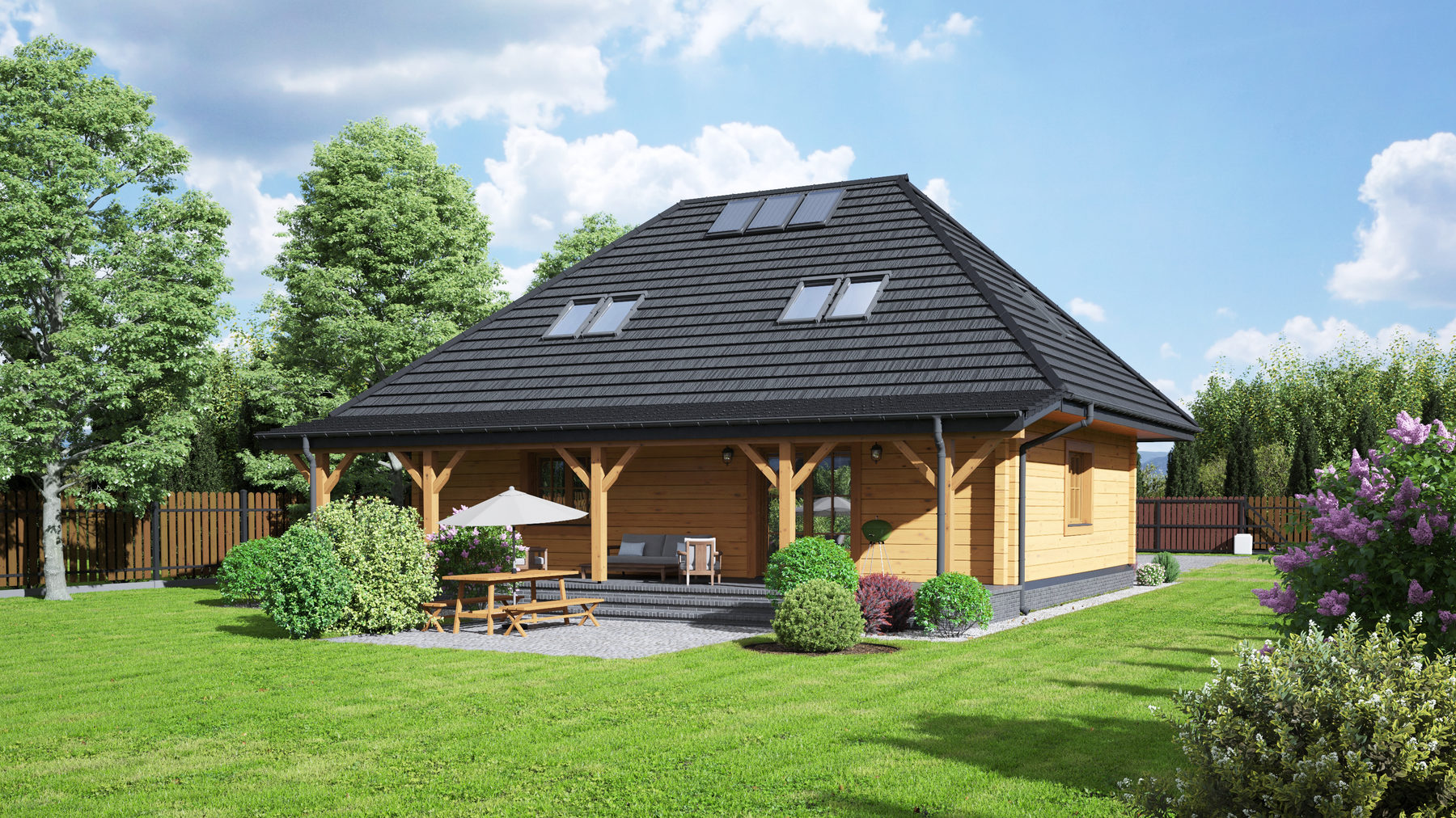 Dom z bali drewnianych. Duży salon z aneksem kuchennym, kominkiem i wyjściem na zadaszony taras. Pokój, łazienka, spiżarka, wiatrołap, kotłownia i schody na poddasze. Na poddaszu cztery pokoje, łazienka i komunikacja.