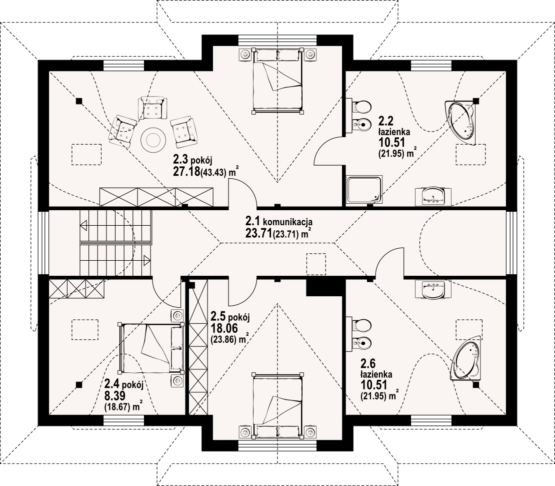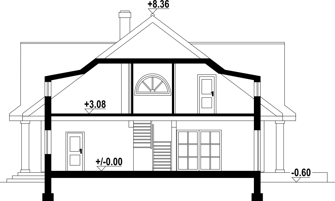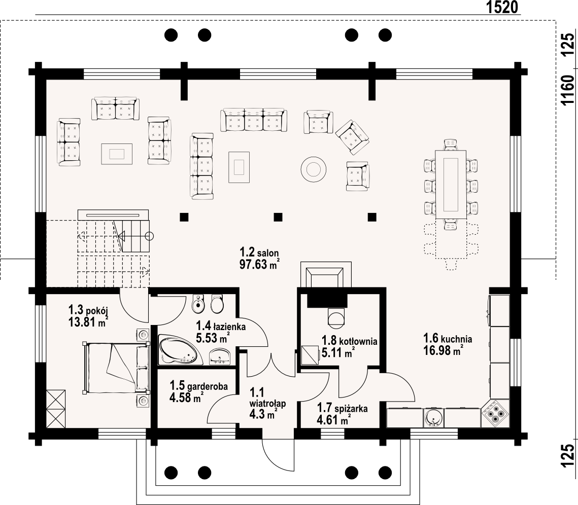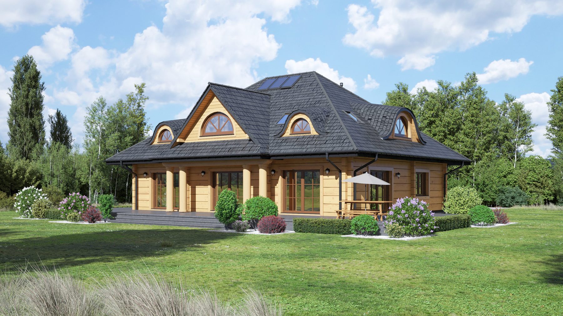Dom z bali drewnianych. Na parterze bardzo duży salon z kominkiem oraz wyjściami na taras. Duża i otwarta na salon kuchnia. Pokój, łazienka, garderoba, wiatrołap, spiżarka, kotłownia. Na poddaszu trzy pokoje, dwie duże łazienki i komunikacja