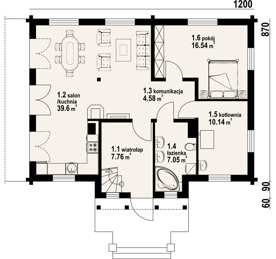Parterowy dom z poddaszem mieszkalnym. Na parterze przestronny salon połączony z aneksem kuchennym. Wyjście z salonu na duży ziemny taras, w salonie kominek. Dodatkowy pokój, łazienka i kotłownia. Na poddaszu trzy pokoje, w tym jeden rekreacyjny z całkowicie przeszkloną ścianą szczytową.