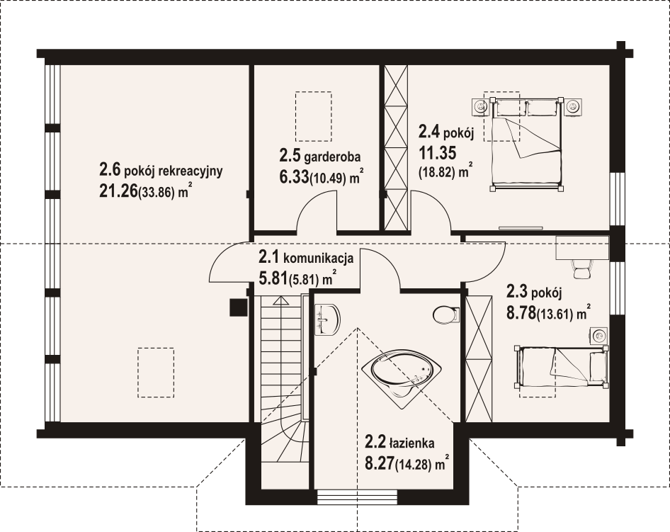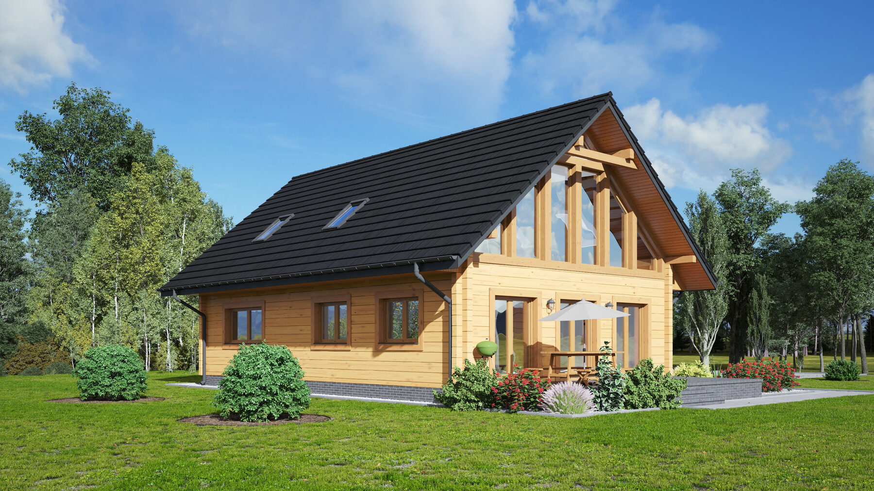 Dom z bali. Na parterze salon z aneksem kuchennym, kominkiem oraz wyjściem na taras. Pokój, łazienka, kotłownia z pralnią, łazienka, komunikacja. Na poddaszu pokój rekreacyjny, dwa pokoje, łazienka, garderoba, komunikacja. Zwarta bryła budynku oraz dach dwuspadowy sprzyjają szybkiej i taniej budowie oraz niskim kosztom eksploatacji