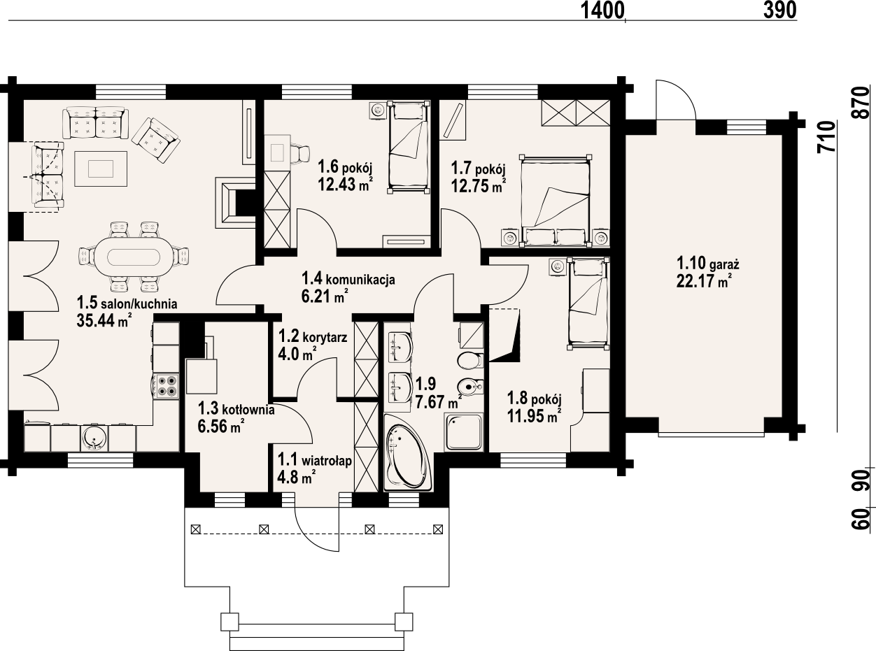 Dom parterowy z dobudowanym garażem. Odpowiednie proporcje pomieszczeń zapewniają wysoki komfort użytkowania. Przestronny, dobrze doświetlony salon z kominkiem i aneksem kuchennym. Ponadto trzy pokoje, łazienka i wydzielona dostępna z wiatrołapu kotłownia.