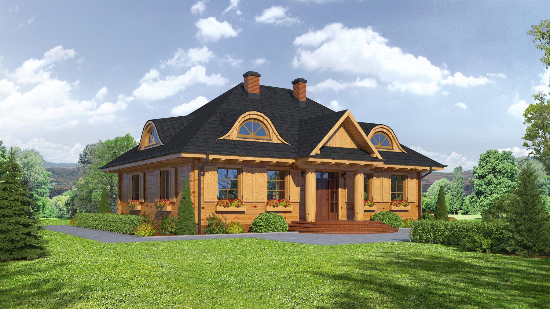 Dom z bali drewnianych. Duży salon z kominkiem i wyjściem na taras, duża kuchnia, duża sypialnia, pokój-gabinet, duża łazienka, duży wiatrołap, garderoba, spiżarka. Na poddaszu cztery duże i wygodne pokoje, duża łazienka i komunikacja.Architektura domu nawiązuje do tradycyjnych polskich dworów