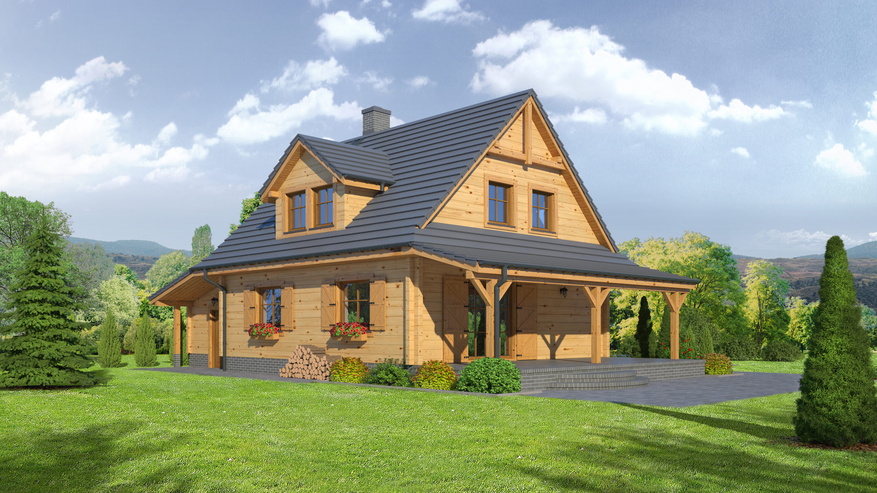 Dom z bali drewnianych. Duży salon z aneksem kuchennym, kominkiem i wyjściem na zadaszony taras. Wiatrołap, łazienka, kotłownia i garaż. Na poddaszu trzy pokoje, łazienka i komunikacja. Zwarta bryła budynku oraz dach dwuspadowy sprzyjają szybkiej i taniej budowie oraz niskim kosztom eksploatacji.