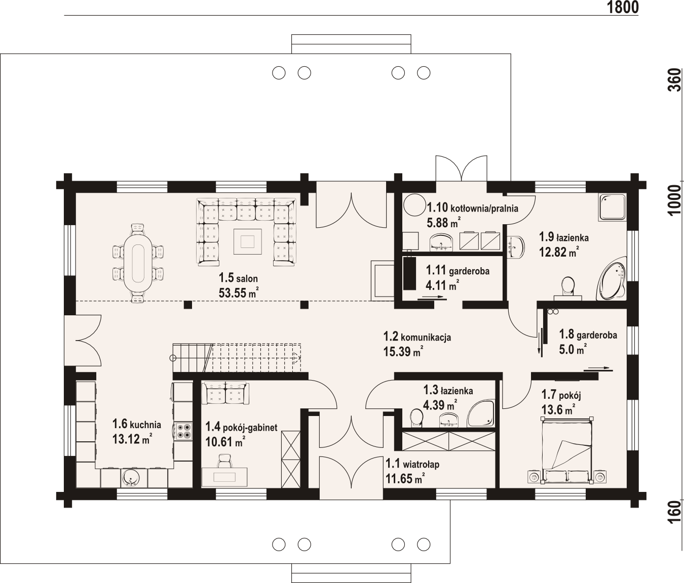 Dom z bali. Duży salon z aneksem kuchennym, kominkiem i wyjściami na taras. Pokój, dwie łazienki, dwie garderoby, pokój-gabinet, wiatrołap i komunikacja. Na poddaszu pokój, łazienka, strych i komunikacja.