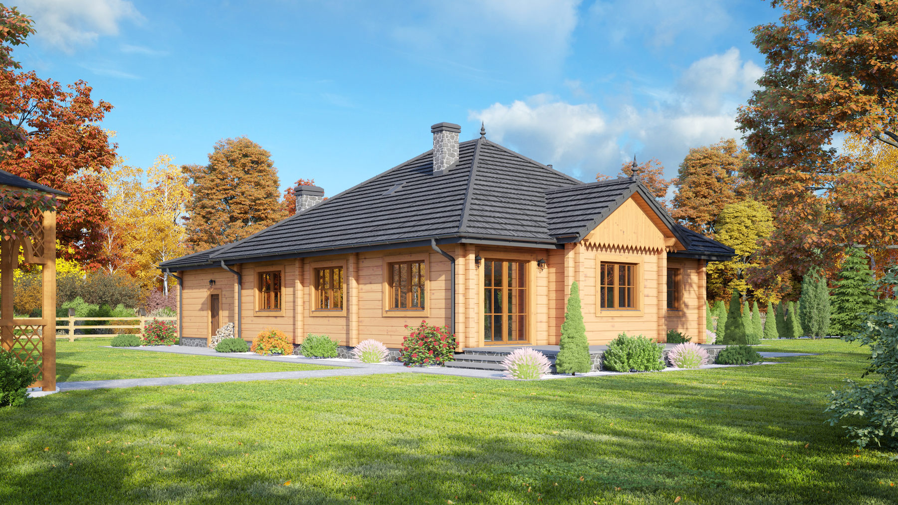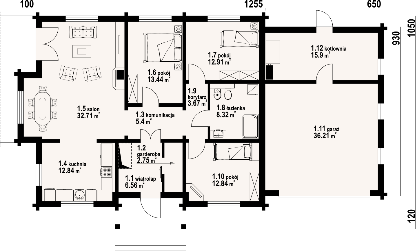 Dom parterowy z bali drewnianych. Duży salon z aneksem kuchennym, kominkiem i wyjściem na taras.Trzy pokoje, łazienka, komunikacja, wiatrołap i garderoba. Garaż na dwa samochody i kotłownia.