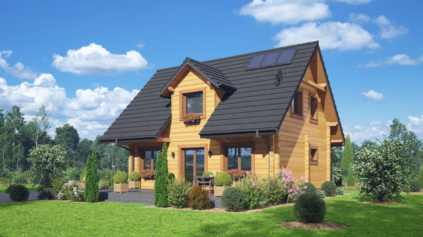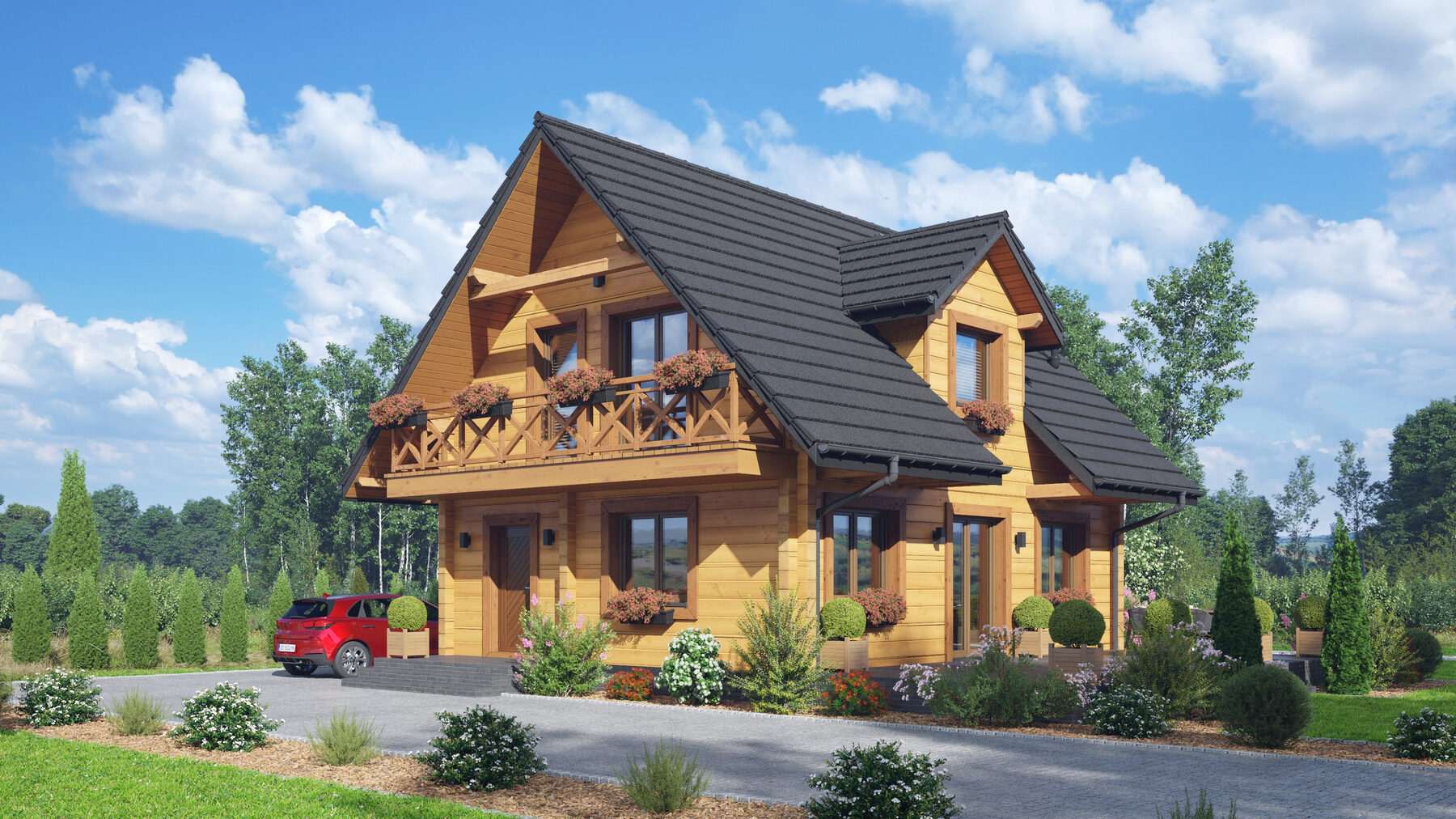 Dom z bali. Na parterze salon z aneksem kuchennym, wyjściem na taras i schodami na poddasze. Wiatrołap, łazienka. Na poddaszu trzy pokoje, łazienka, komunikacja. Balkon dostępny z dwóch pokoi. Zwarta bryła budynku oraz dach dwuspadowy sprzyjają szybkiej i taniej budowie oraz niskim kosztom eksploatacji.