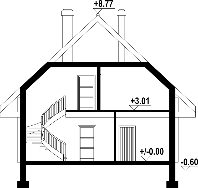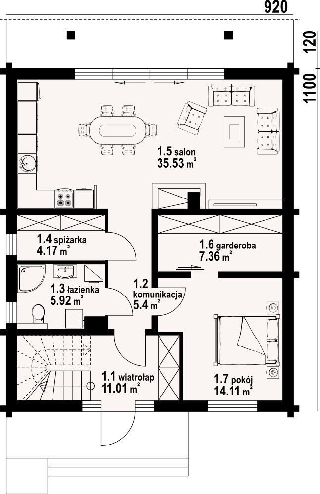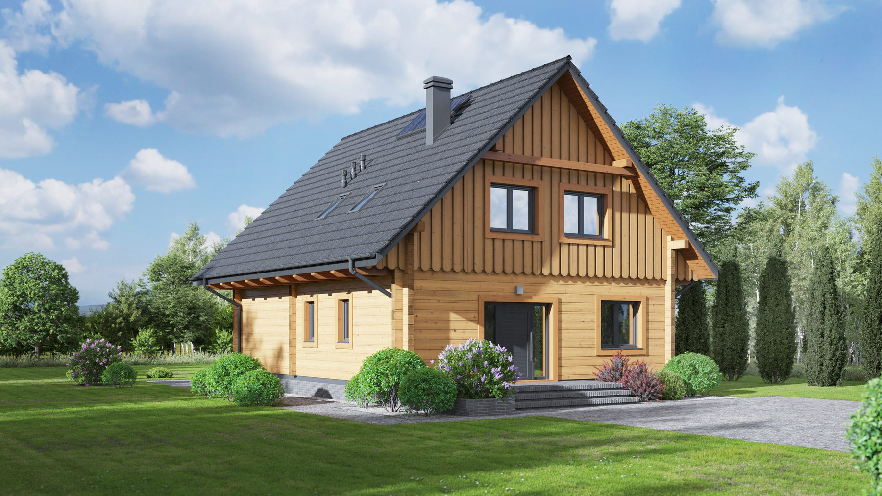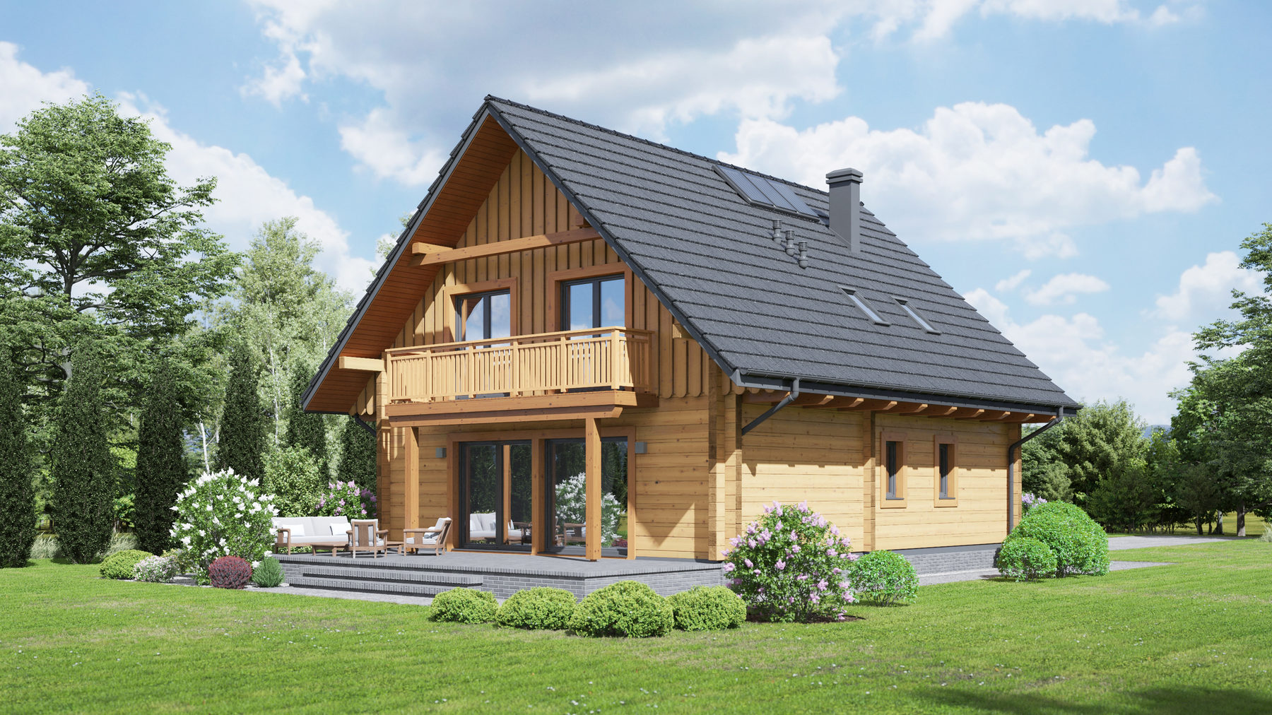 Dom z bali. Duży salon z aneksem kuchennym, kominkiem i wyjściem na taras. Pokój, garderoba, spiżarka, łazienka, komunikacja i wiatrołap. Na poddaszu trzy pokoje, łazienka, wc, garderoba i balkon. Zwarta bryła budynku i dach dwuspadowy sprzyjają szybkiej i taniej budowie i niskim kosztom eksploatacji.