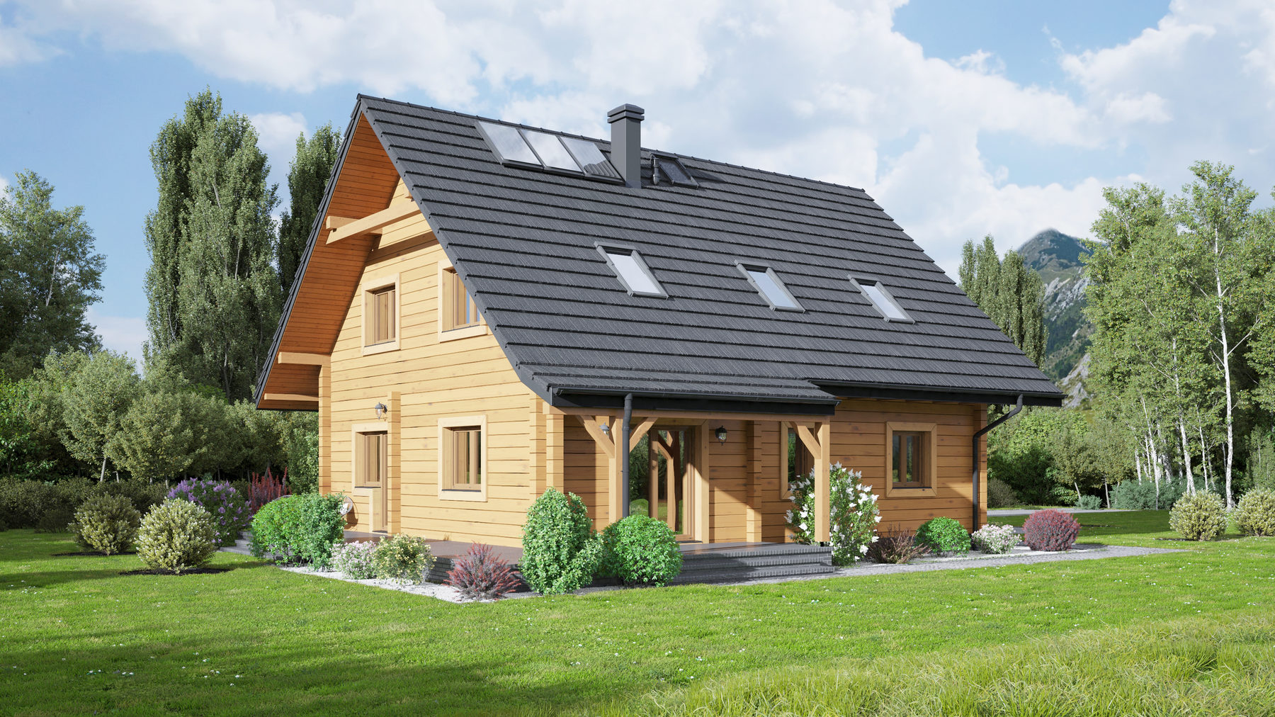 Dom z bali. Na parterze salon z aneksem kuchennym, wyjściem na taras i schodami na poddasze. Pokój do pracy, komunikacja, wiatrołap, wc z piecem gazowym. Na poddaszu trzy pokoje, łazienka, garderoba, komunikacja. Zwarta bryła budynku oraz dach dwuspadowy sprzyjają szybkiej i taniej budowie oraz niskim kosztom eksploatacji.