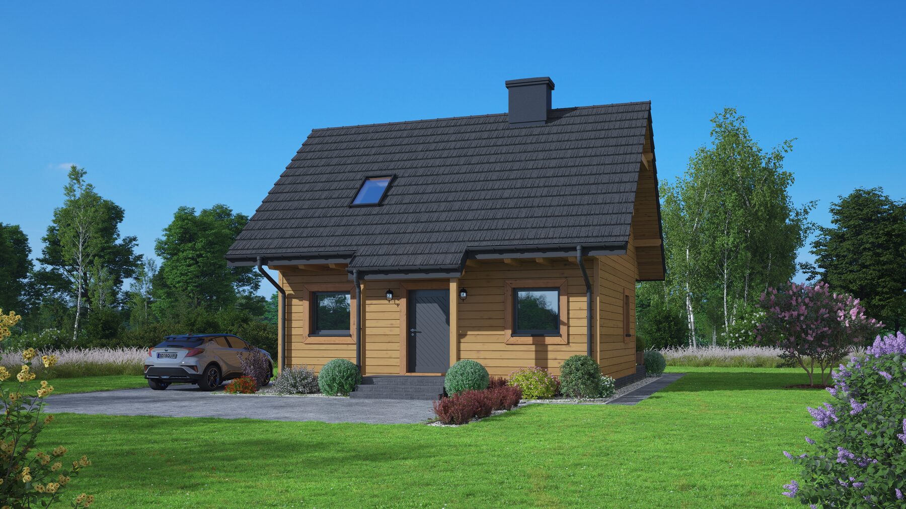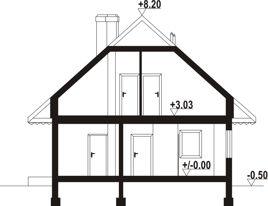 Dom w konstrukcji szkieletu drewnianego. Duży salon z aneksem kuchennym, kominkiem i wyjściem na taras. Pokój, łazienka, spiżarka, komunikacja, wiatrołap, kotłownia. Na poddaszu cztery pokoje, łazienka, garderoba, komunikacja i balkon. Zwarta bryła budynku i dach dwuspadowy sprzyjają szybkiej i taniej budowie i niskim kosztom eksploatacji.